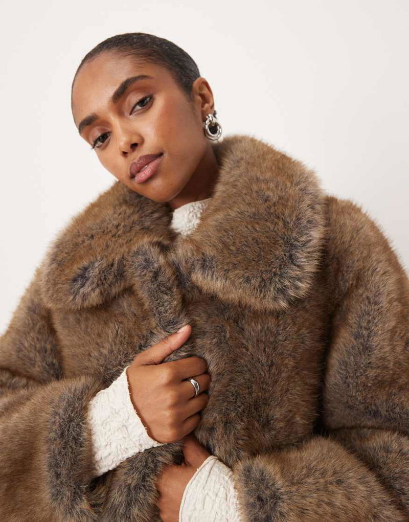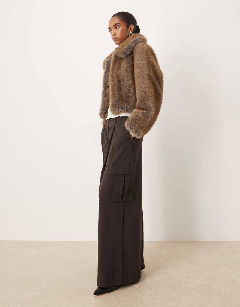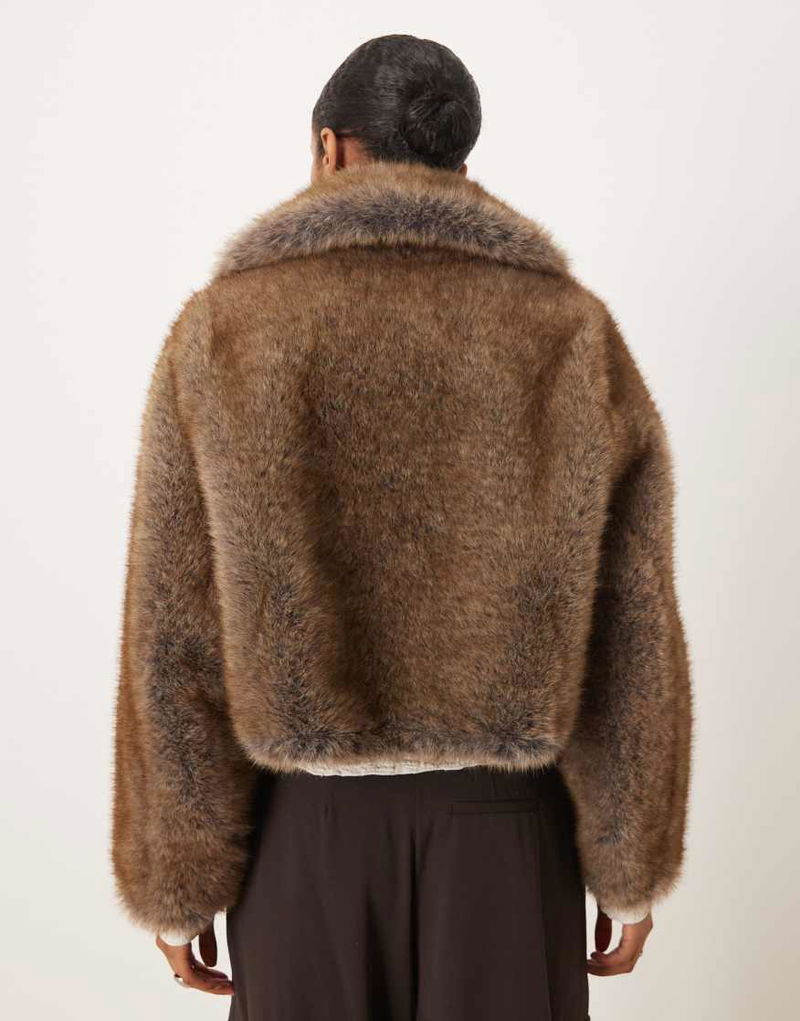 Faux Fur Cropped Jacket With Collar Detail In Brown