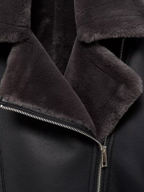 Faux fur fabric, Biker design, Medium design, Lapel-collar V-neck collar, Long sleeve, Buckled folded cuffs, Side zip pockets, Zip fastening.