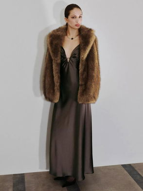 Suede leather effect, Long design, Lapel-collar, Lapel with notch, Long sleeve, Faux-fur lining, Two side welt pockets, Button fastening on the front section, Side length 26.22 in Back length 38.74 in.