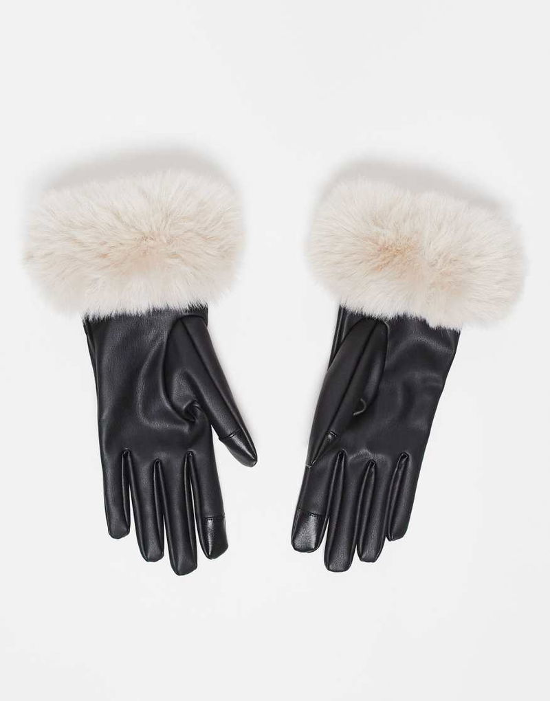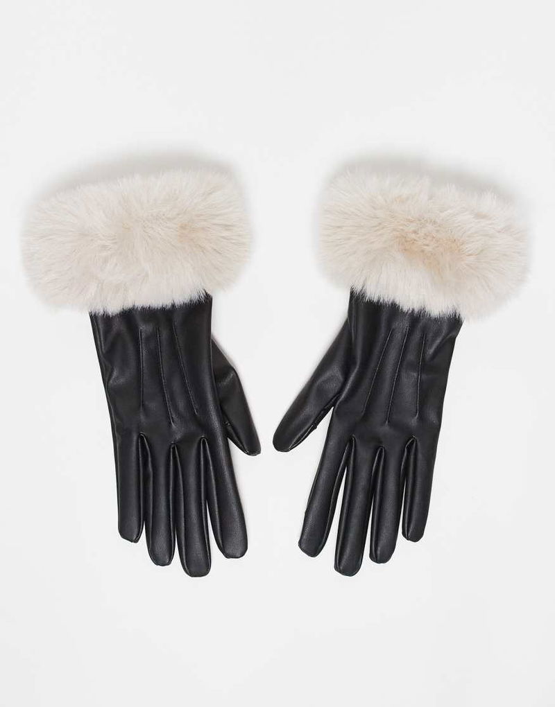 Faux Leather Gloves With Faux Fur Trim In Oat