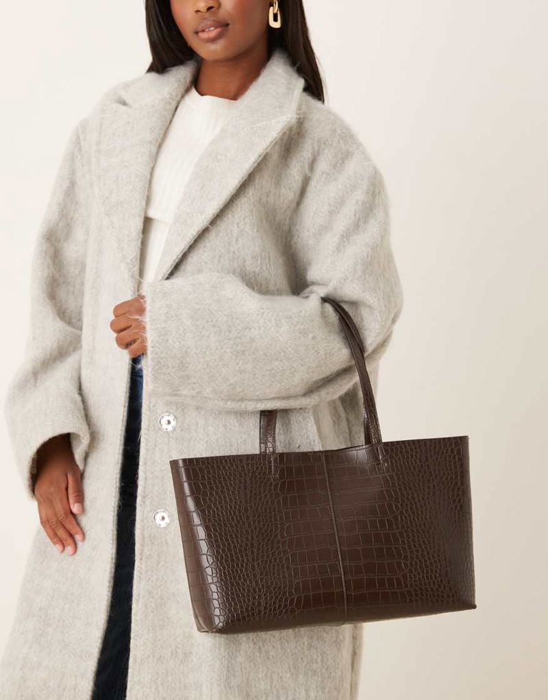 Faux Leather Rectangle Shoulder Bag In Dark Brown
