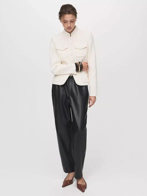 Faux leather, Slouchy fit, Elastic waist, Zip and one button fastening, Two side pockets, Cuffed hem.