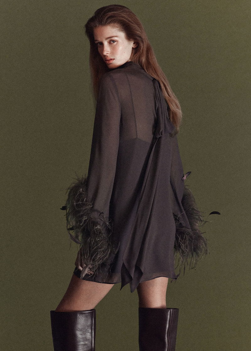 This dress embodies a retro-chic aesthetic that recalls the sophistication of the 70s, but with a modern twist. The flared sleeves, adorned with feathers, add a theatrical element that makes this garment the perfect centrepiece for special occasions. Short design. A-line design. High collar. Bow detail at the neck. Long flared sleeve. Feather embellishment on the sleeves. Back closure.