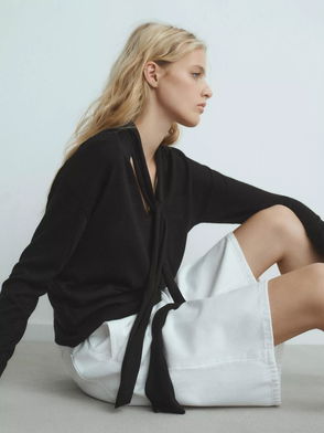 Fine knit fabric, Rounded neck, Long sleeve with elastic cuffs, Wide sleeve.