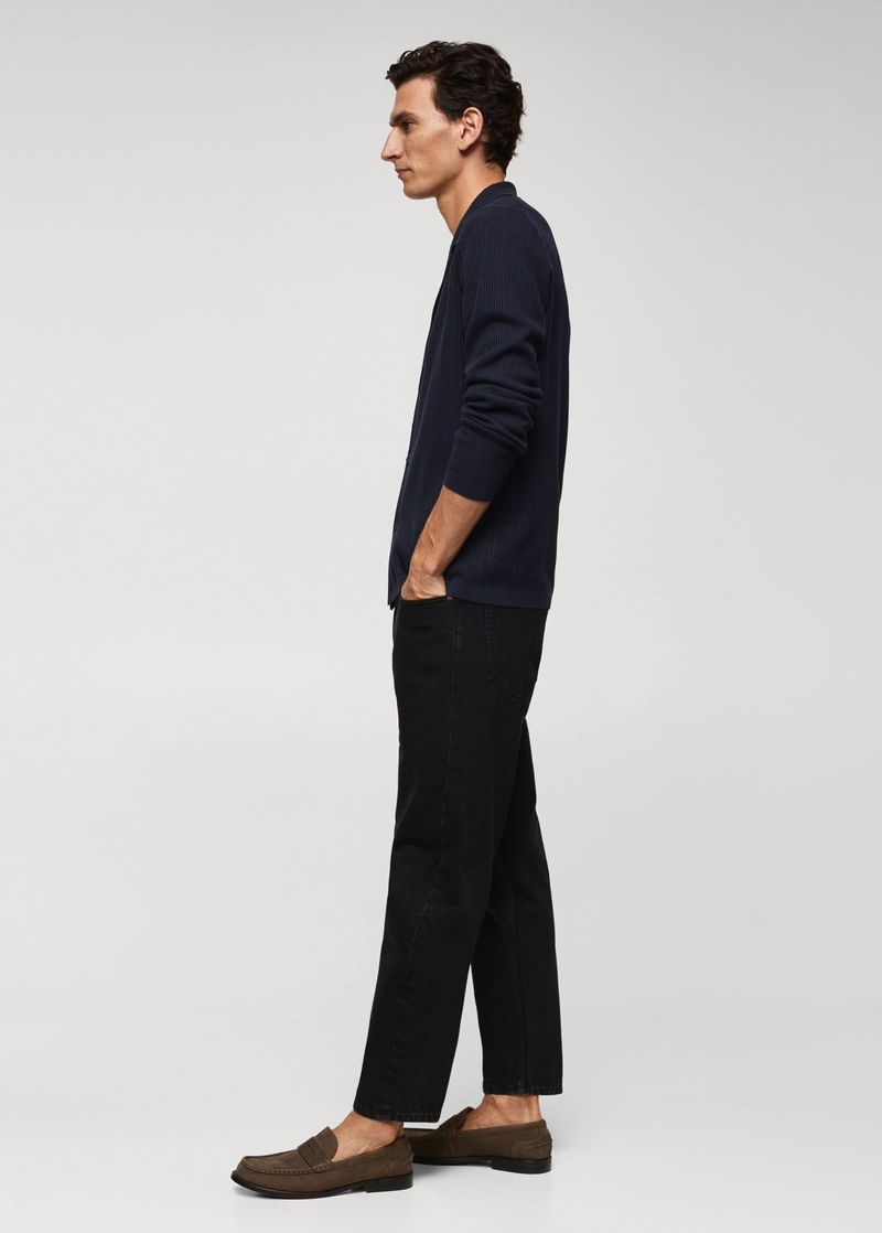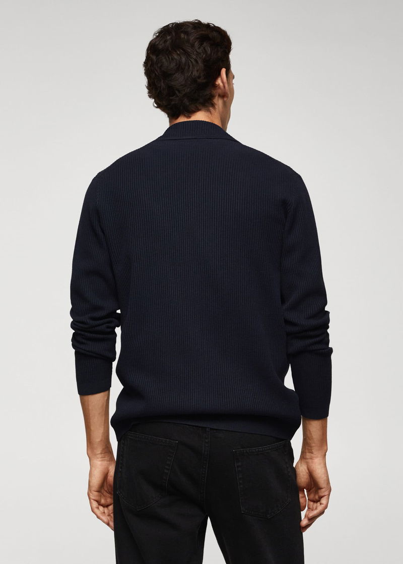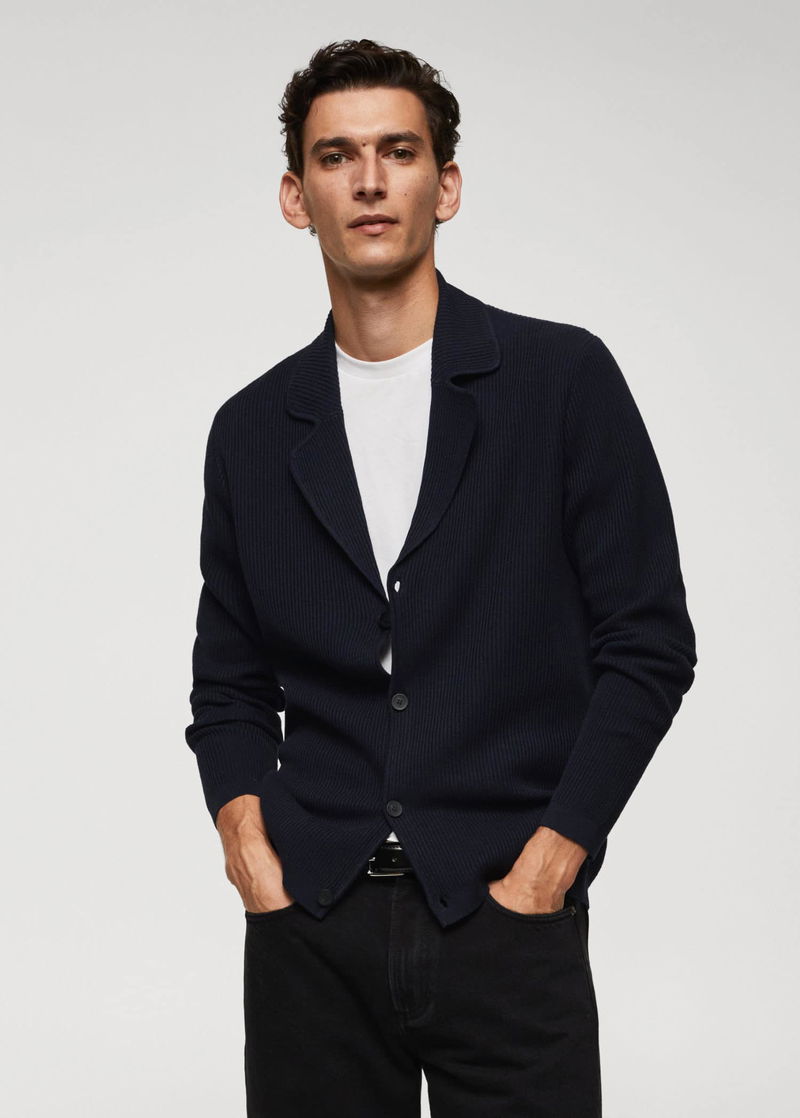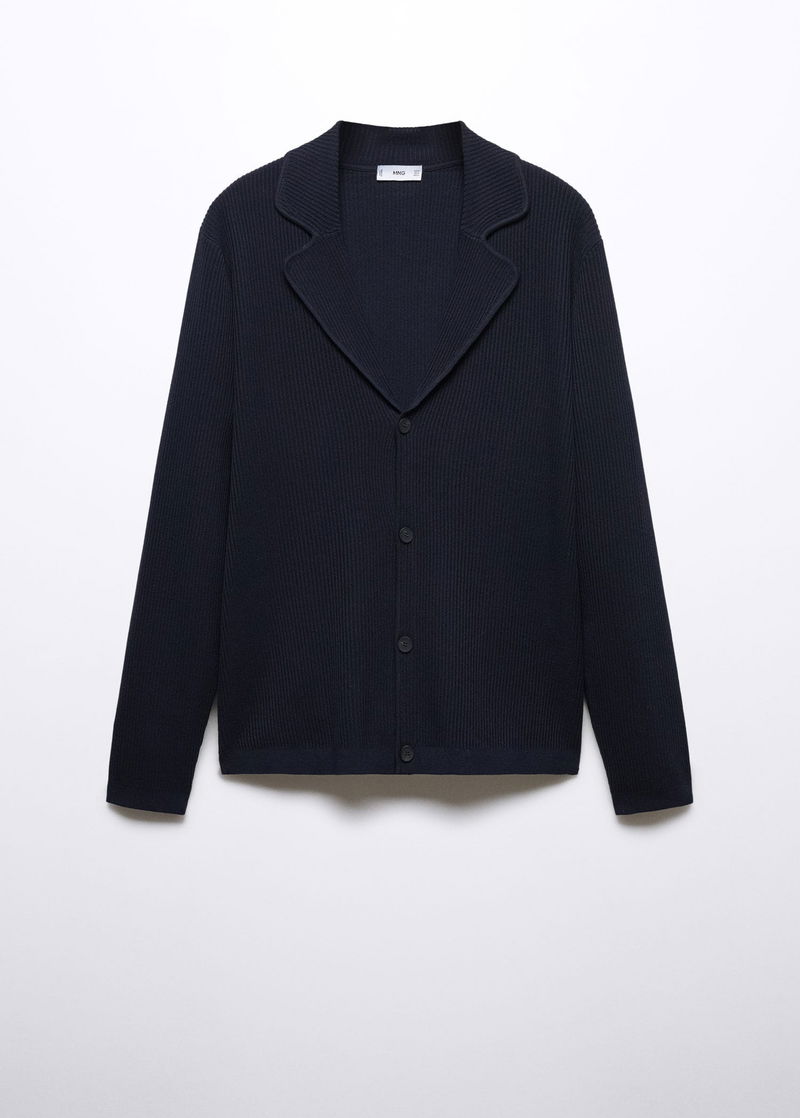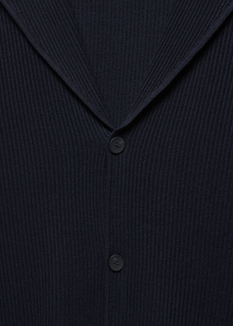 Recycled cotton and polyester blend fabric, Fine knit fabric, Straight design, Lapel-collar, Ribbed design, Front button closure, Long sleeve, Straight hem.
