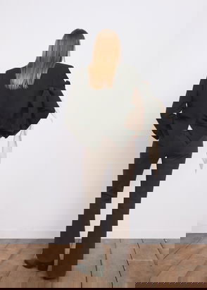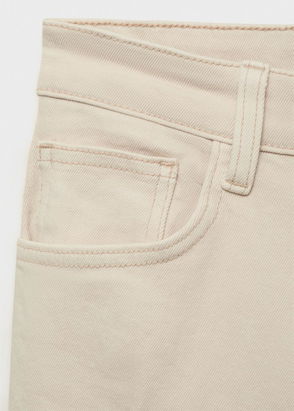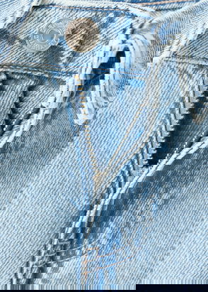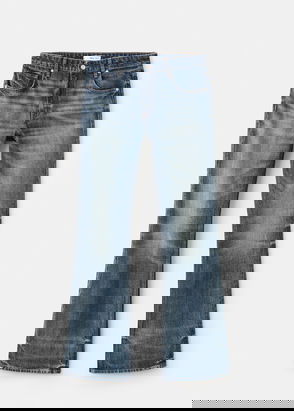 Denim-style cotton fabric. Long design. Flare design. Mid-rise. Belt loops. Five pockets. Frayed hem. Front zipper and button closure. Inseam 83 cm. Available Plus. Comfort fabric with elasticity.