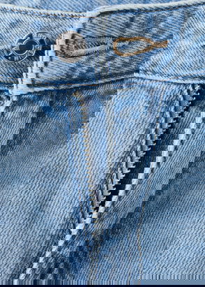 Denim style cotton fabric, Flare design, Long design, Loops, Five pockets, Zip and one button fastening.
