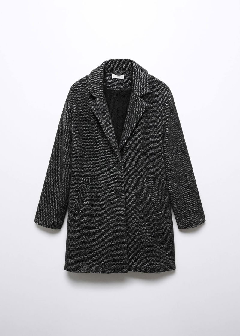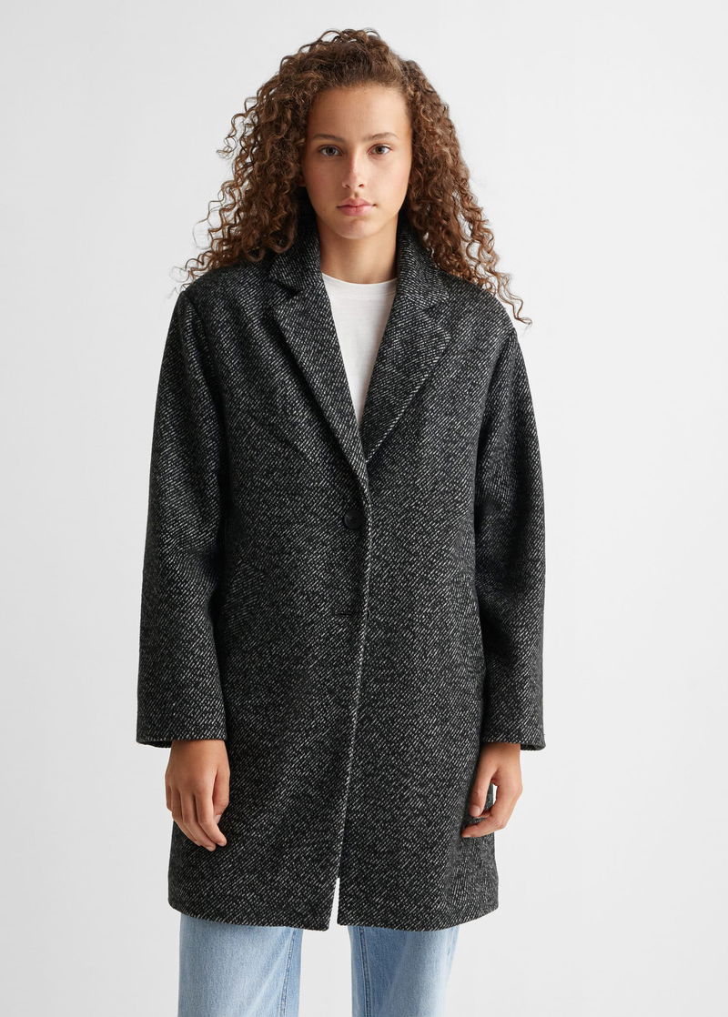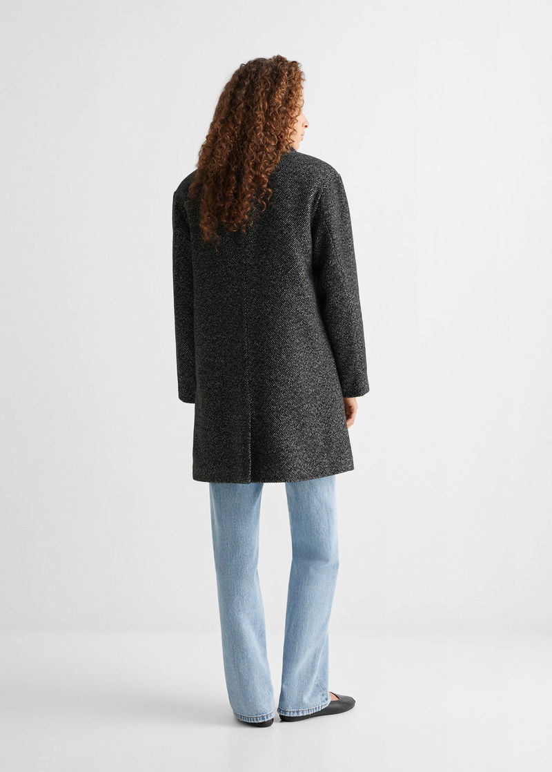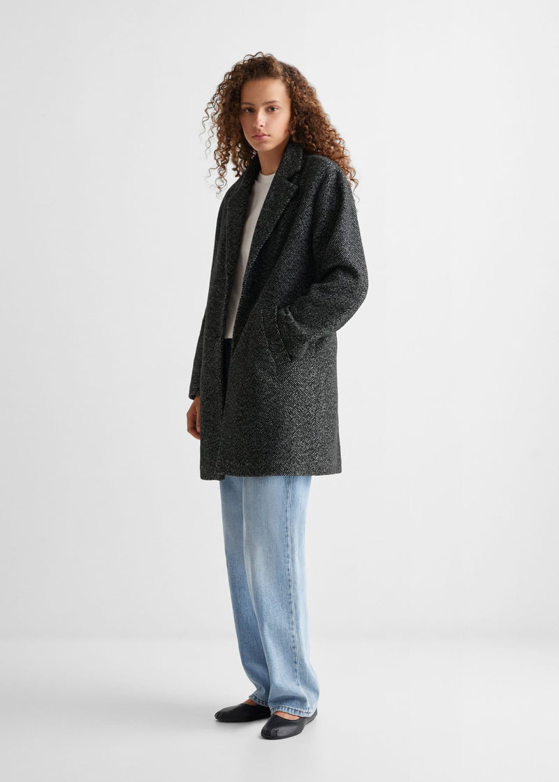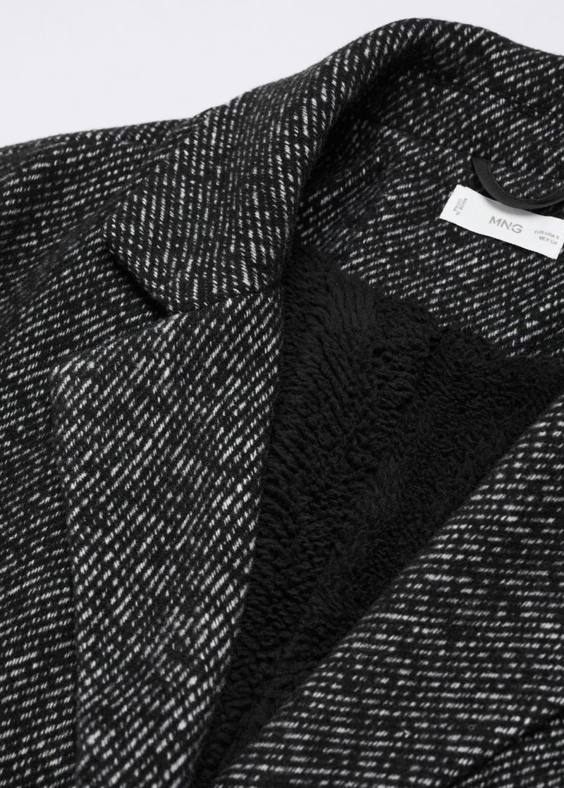 Flecked design. Faux shearling interior. Two pockets with flaps. Shirt-style V-neck collar. Long sleeve. One button fastening.