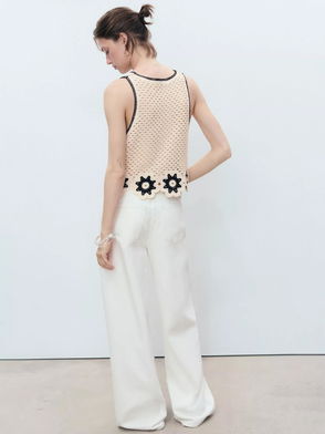 Cotton-blend fabric, Fine knit fabric, Tailored dress, Floral pattern, Openwork details, Rounded neck, Wide straps, Unclosed.