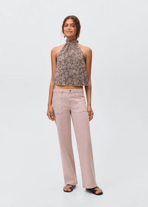 Denim style cotton fabric, Long design, Ruffles detail, Five pockets, Zip and one button fastening, Loops.