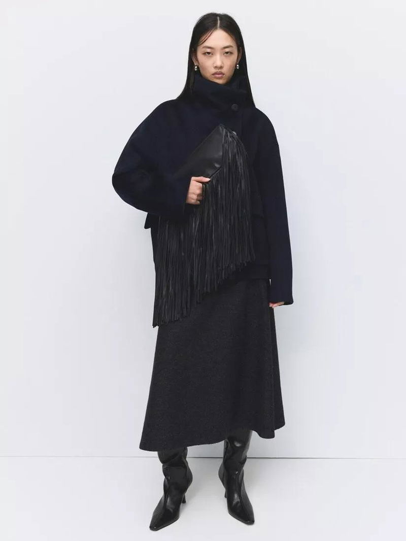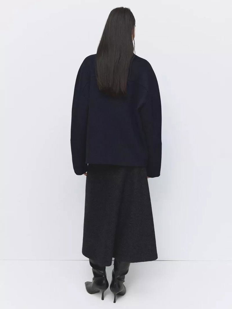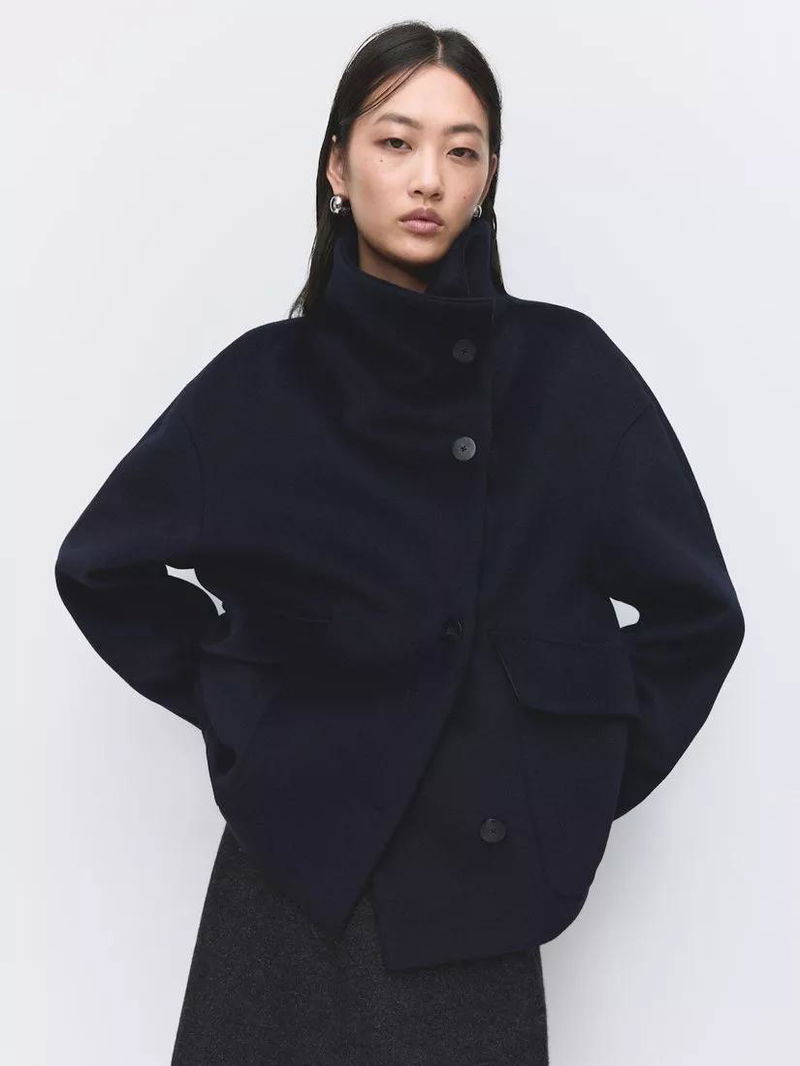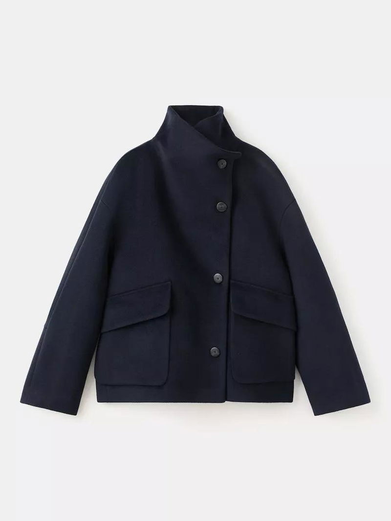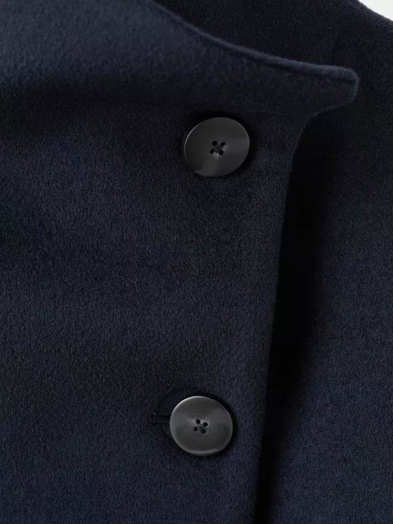 Funnel Neck Cropped Wool Blend Coat, Navy