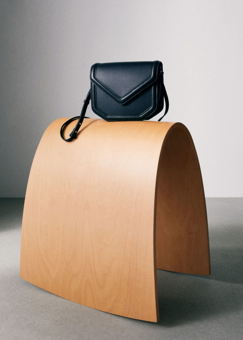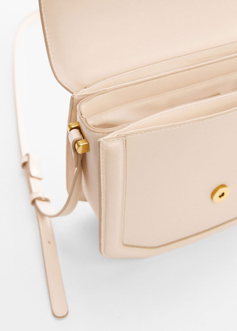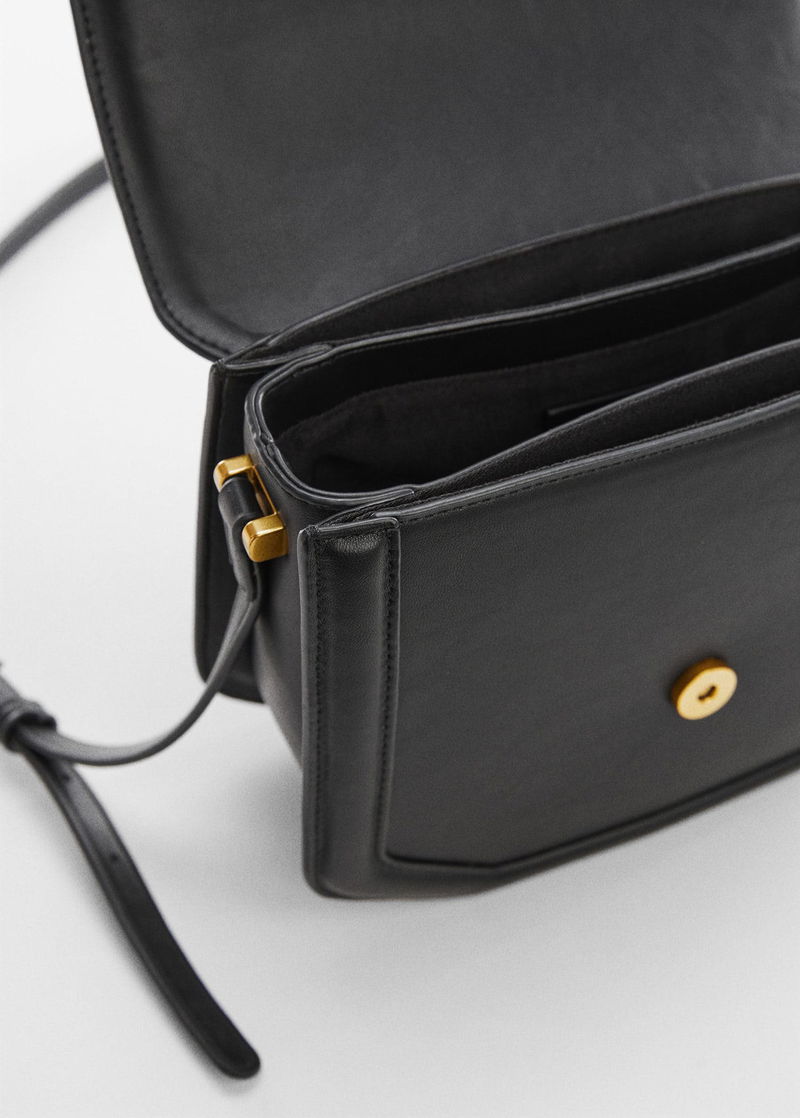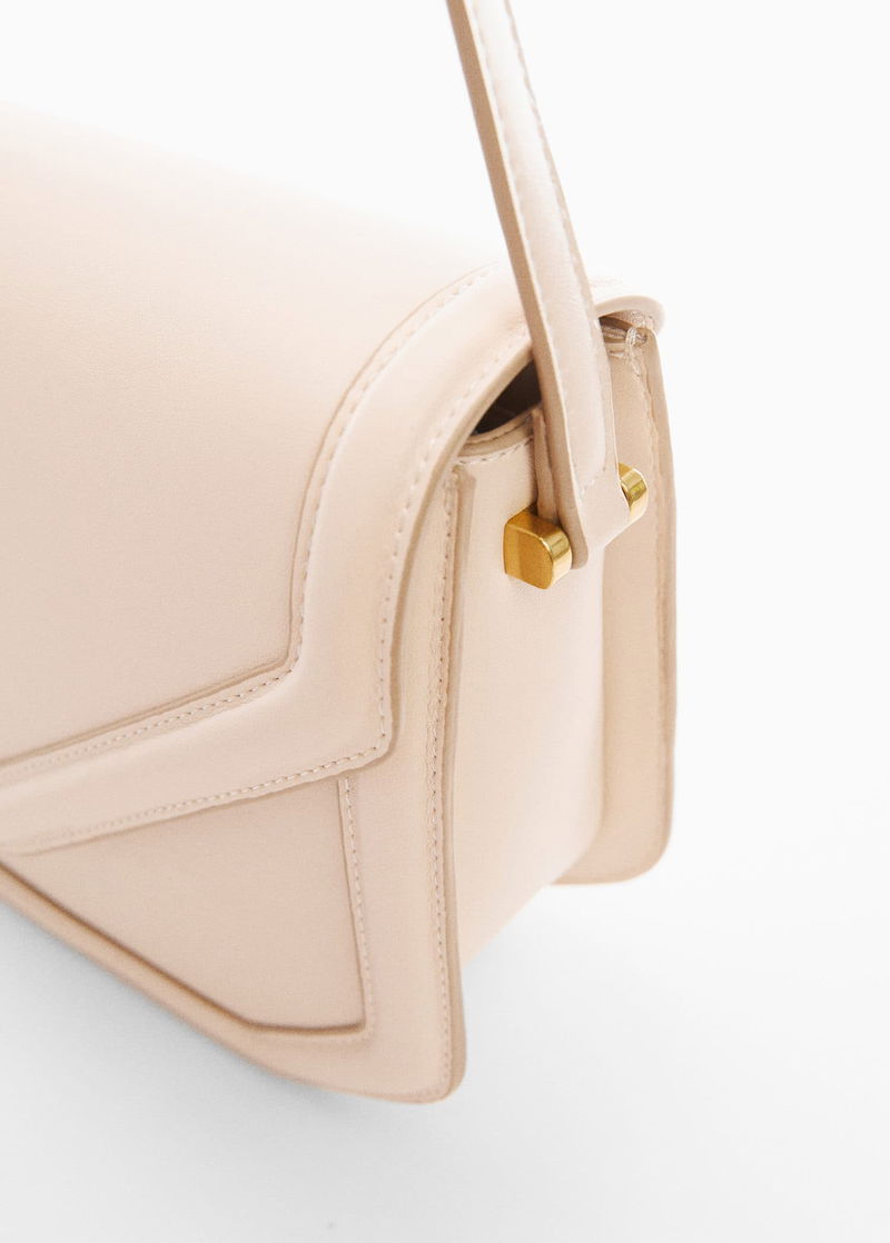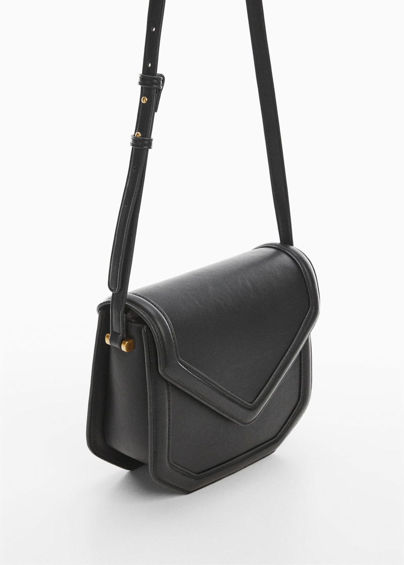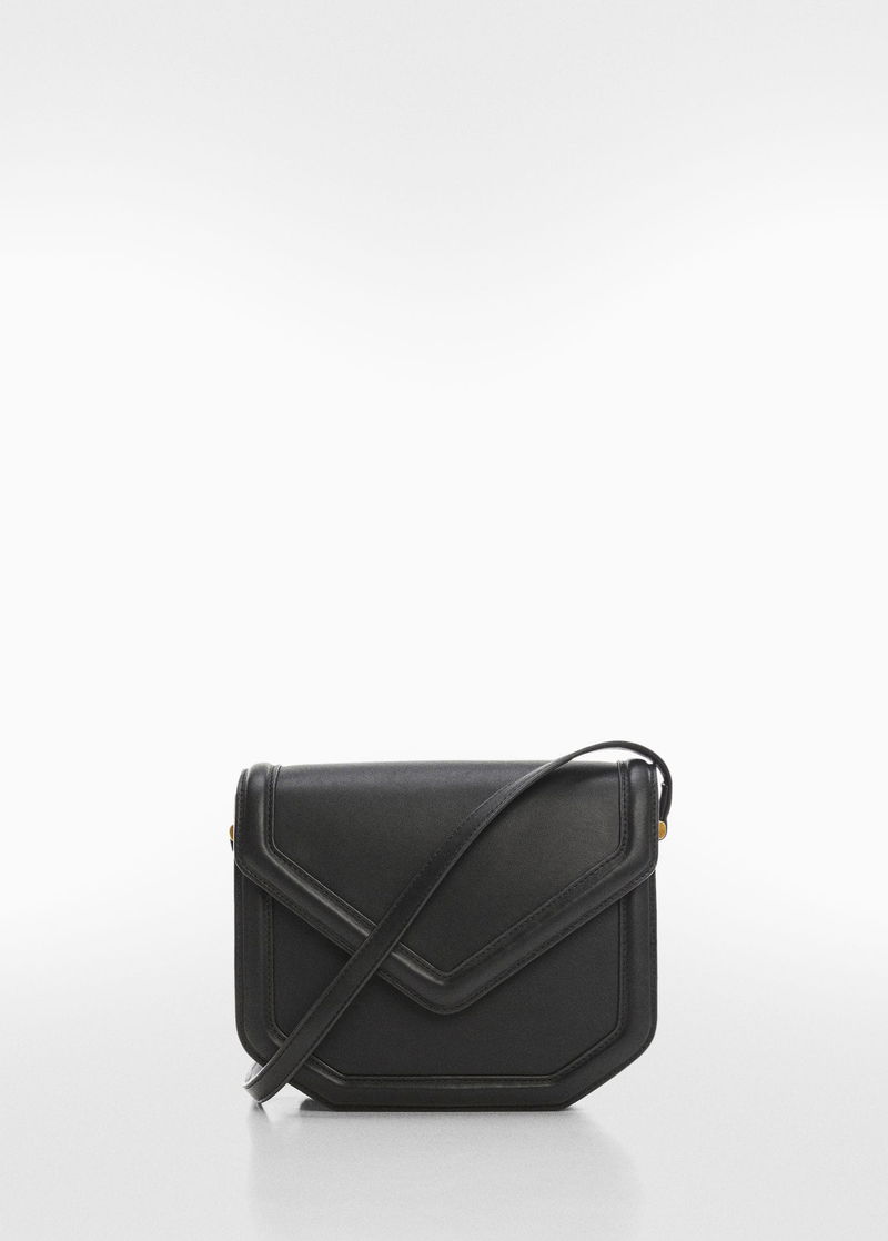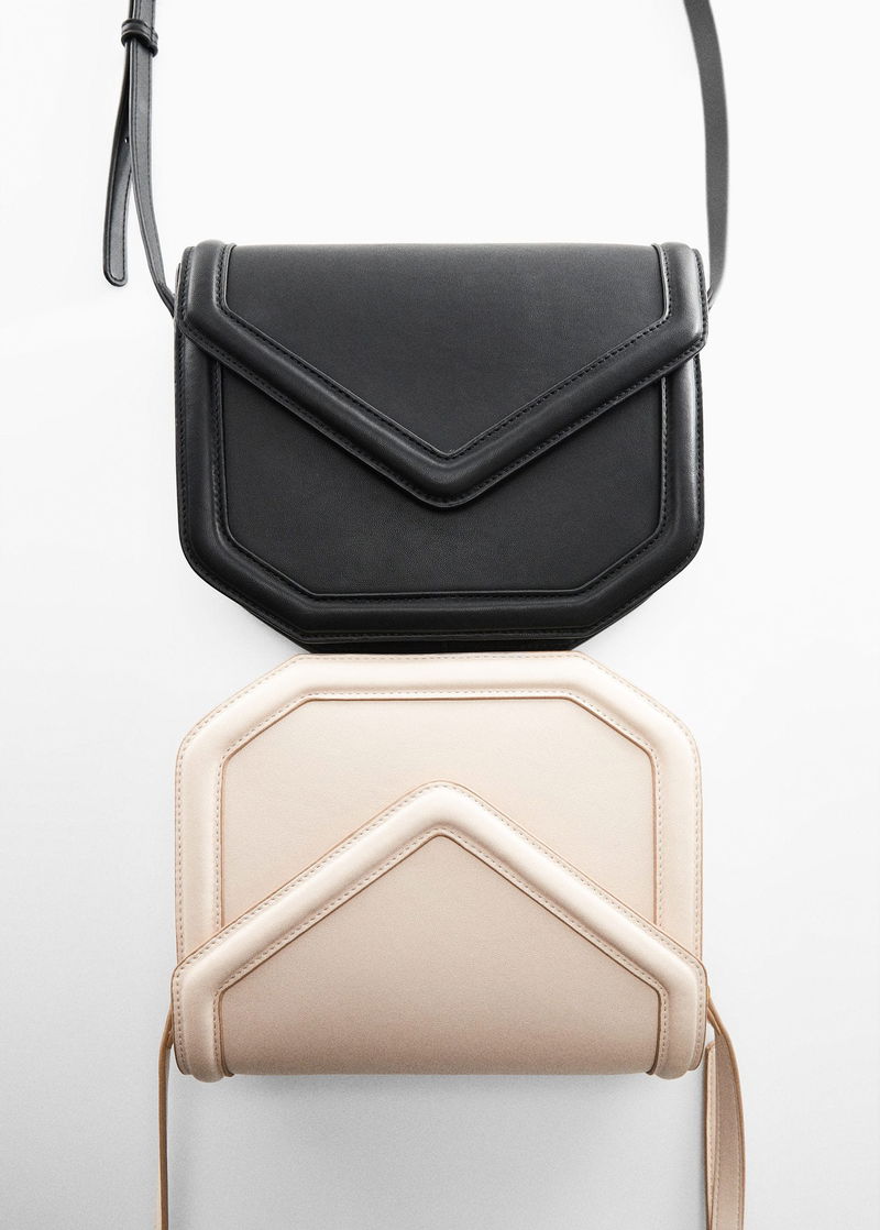 Geometric design, Flap closure with magnetic button, Long adjustable strap, Inner lining.