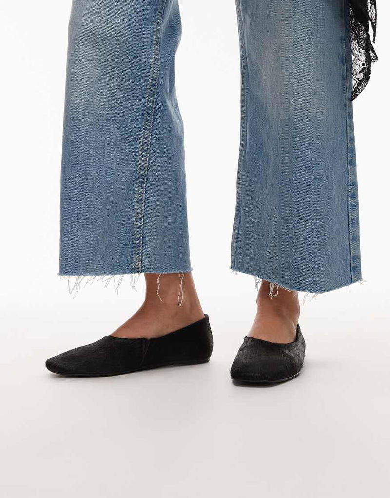 Hair On Real Leather Square Toe Flat Shoe In Black