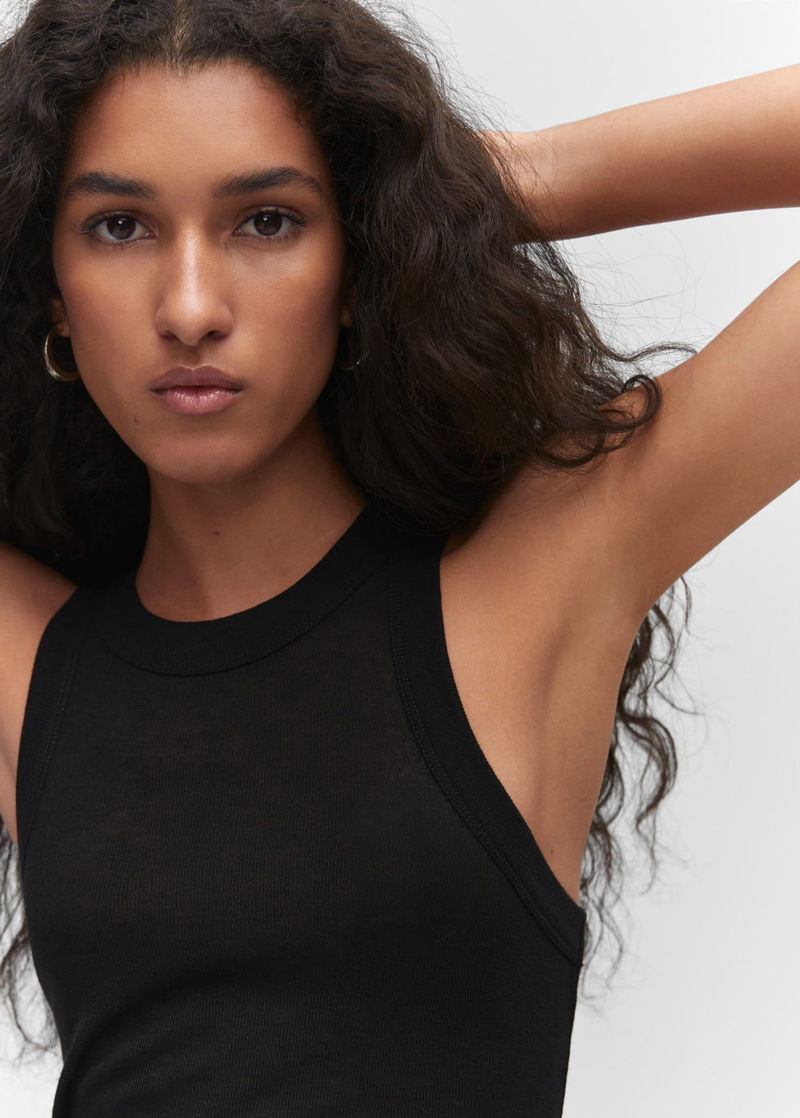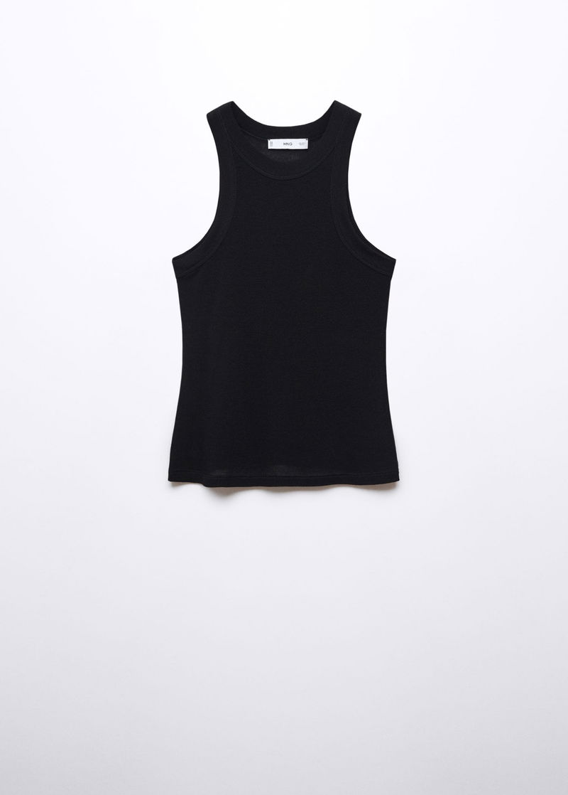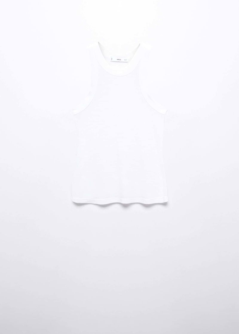 Flowy fabric, Tailored design, Halter neck, Wide straps, Sleeveless, Unclosed.