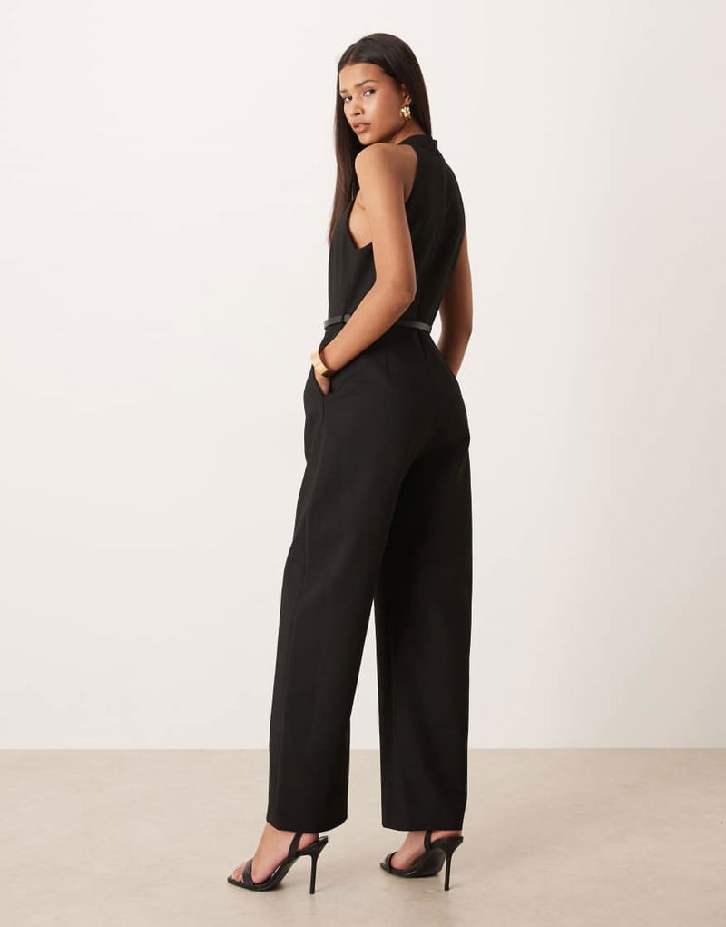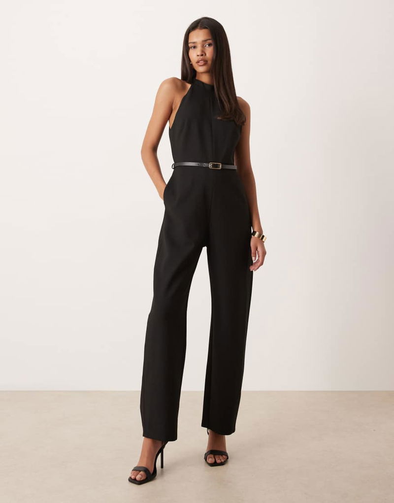 Halterneck Belted Barrel Jumpsuit In Black
