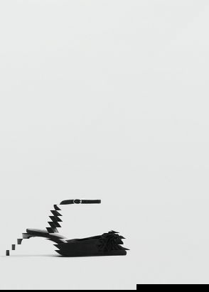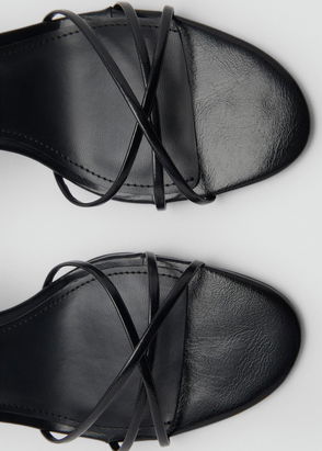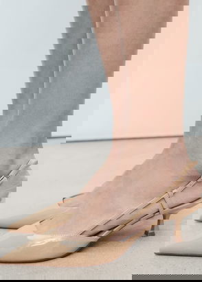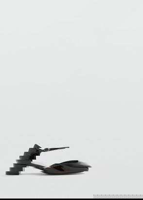 Shiny finish, Straps design, Sling back, Rounded toe, Block heel, Buckle, Decorative buckle.