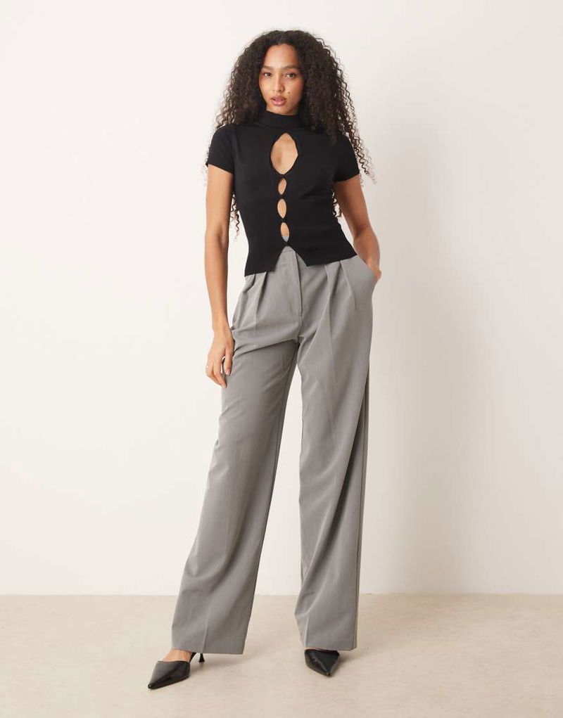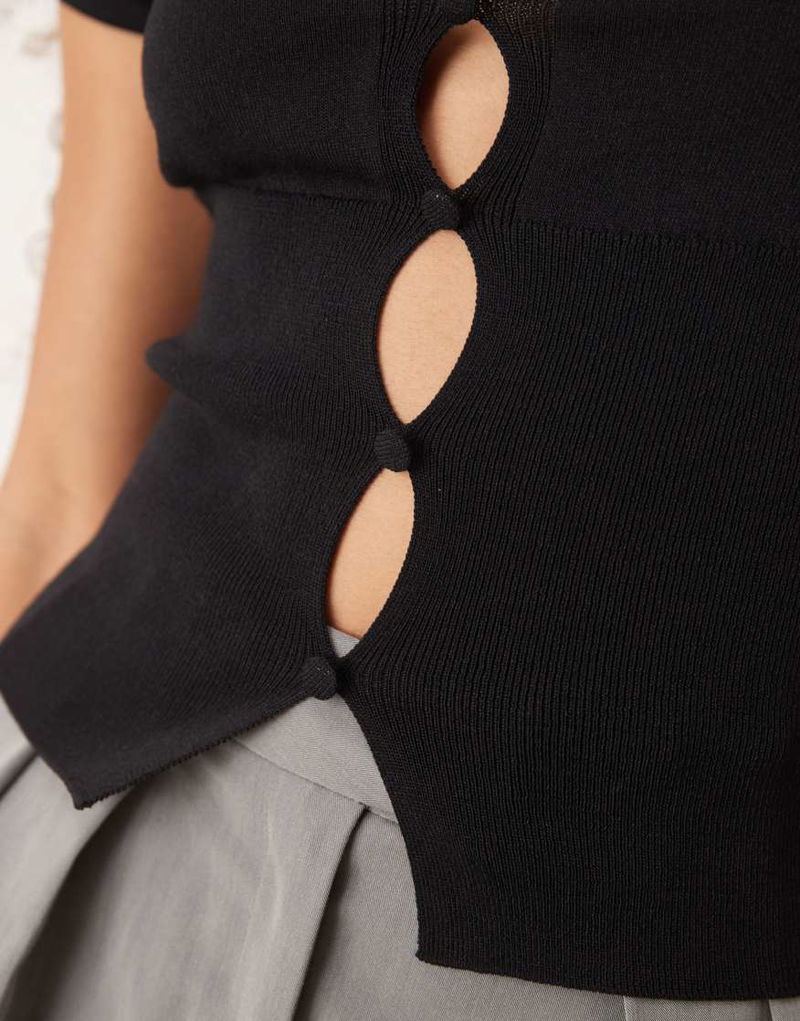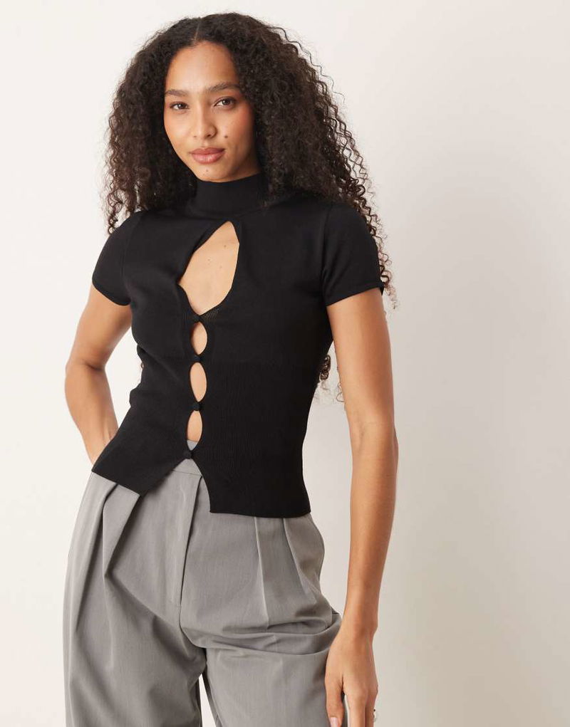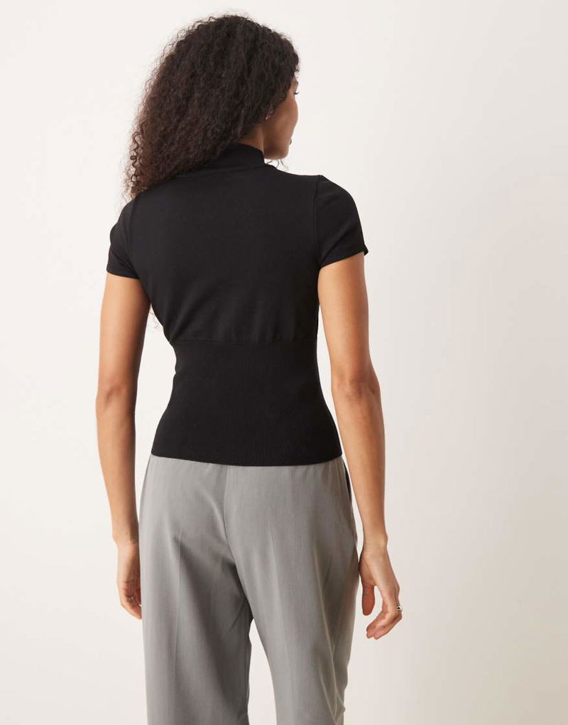 High Neck Knitted Short Sleeve Top With Cut Out Detail In Black