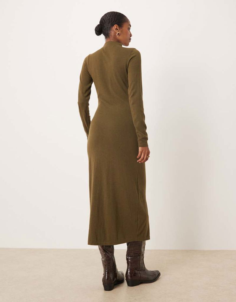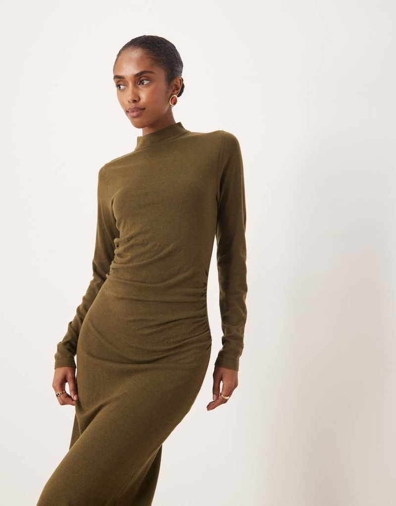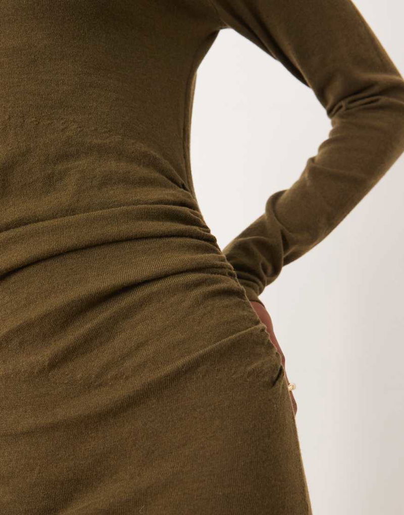 High Neck Ruched Waist Maxi Dress In Khaki