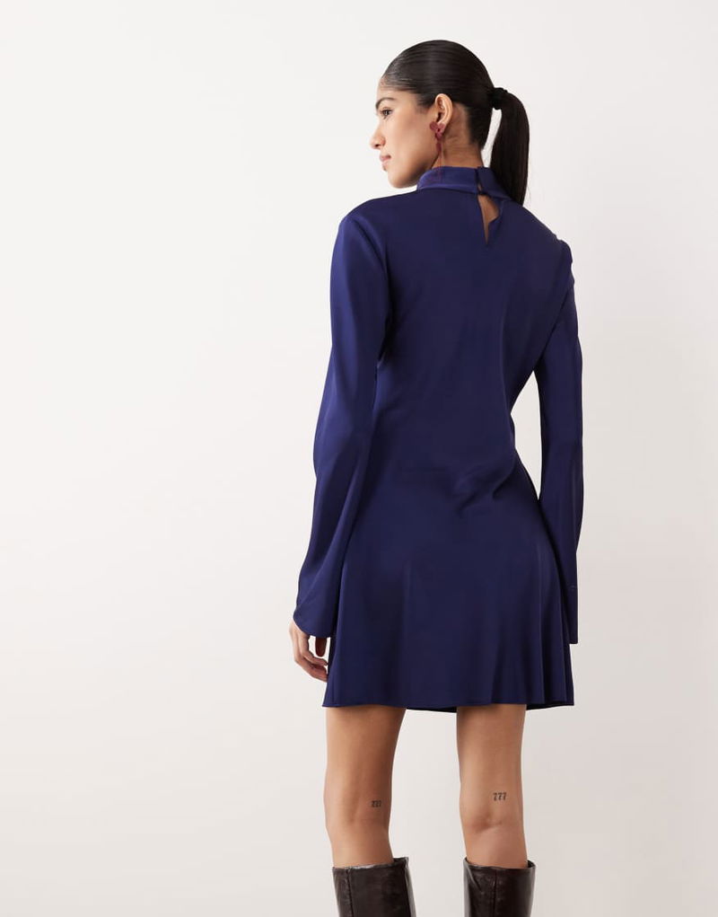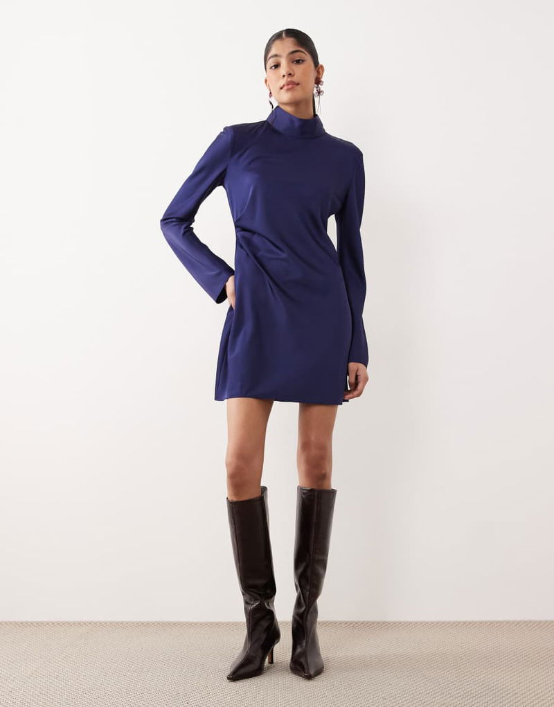 High Neck Satin Long Sleeve Ruched Side Mini Dress In Electric Blue