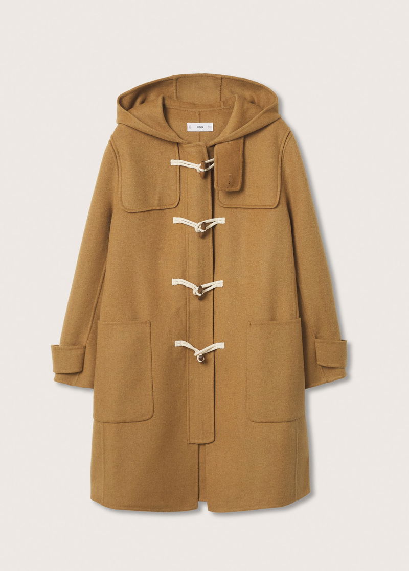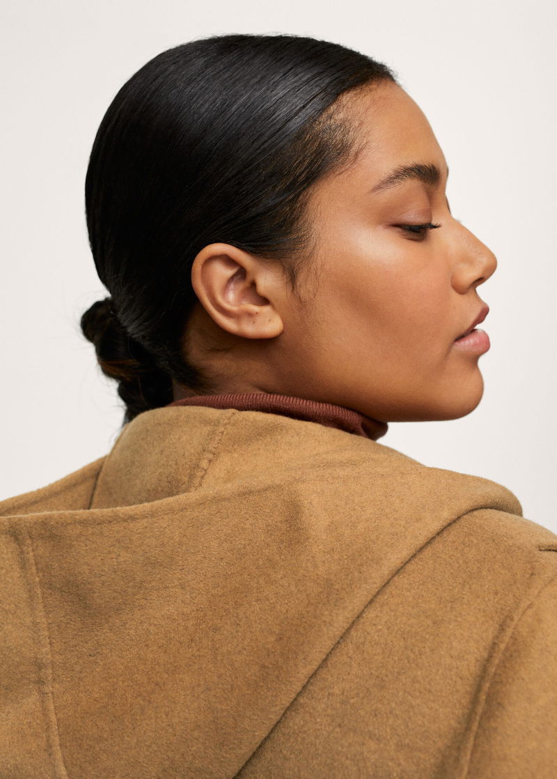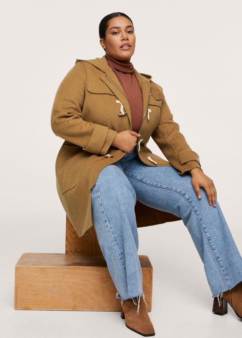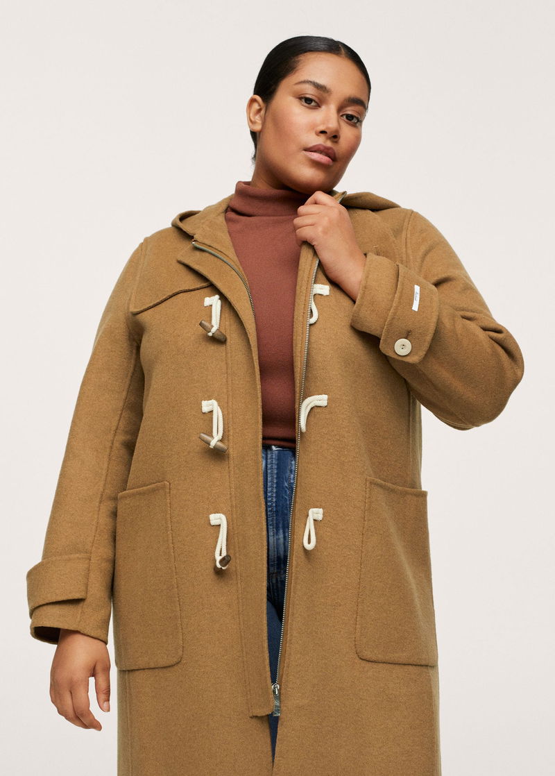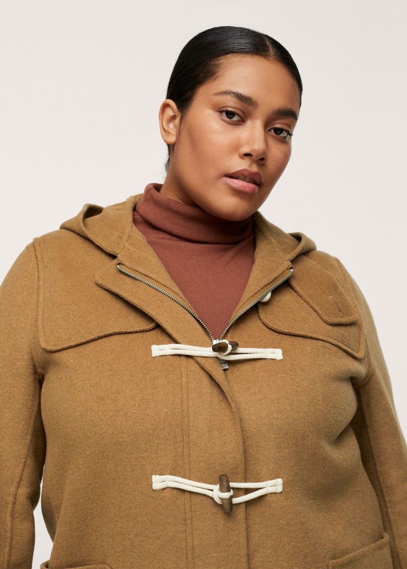 Fabric with wool, Straight design, Midi fit, Hood, Long buttoned sleeve, Two patch pockets on the front, Zip and button fastening.
