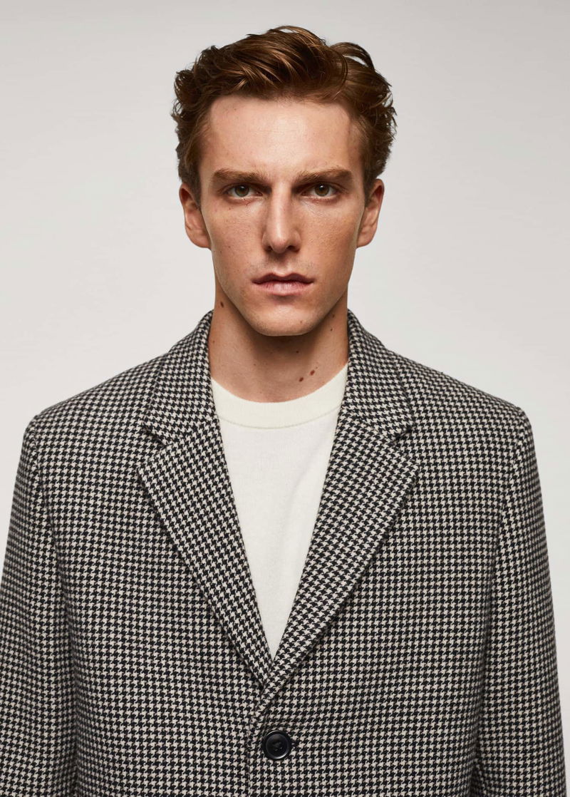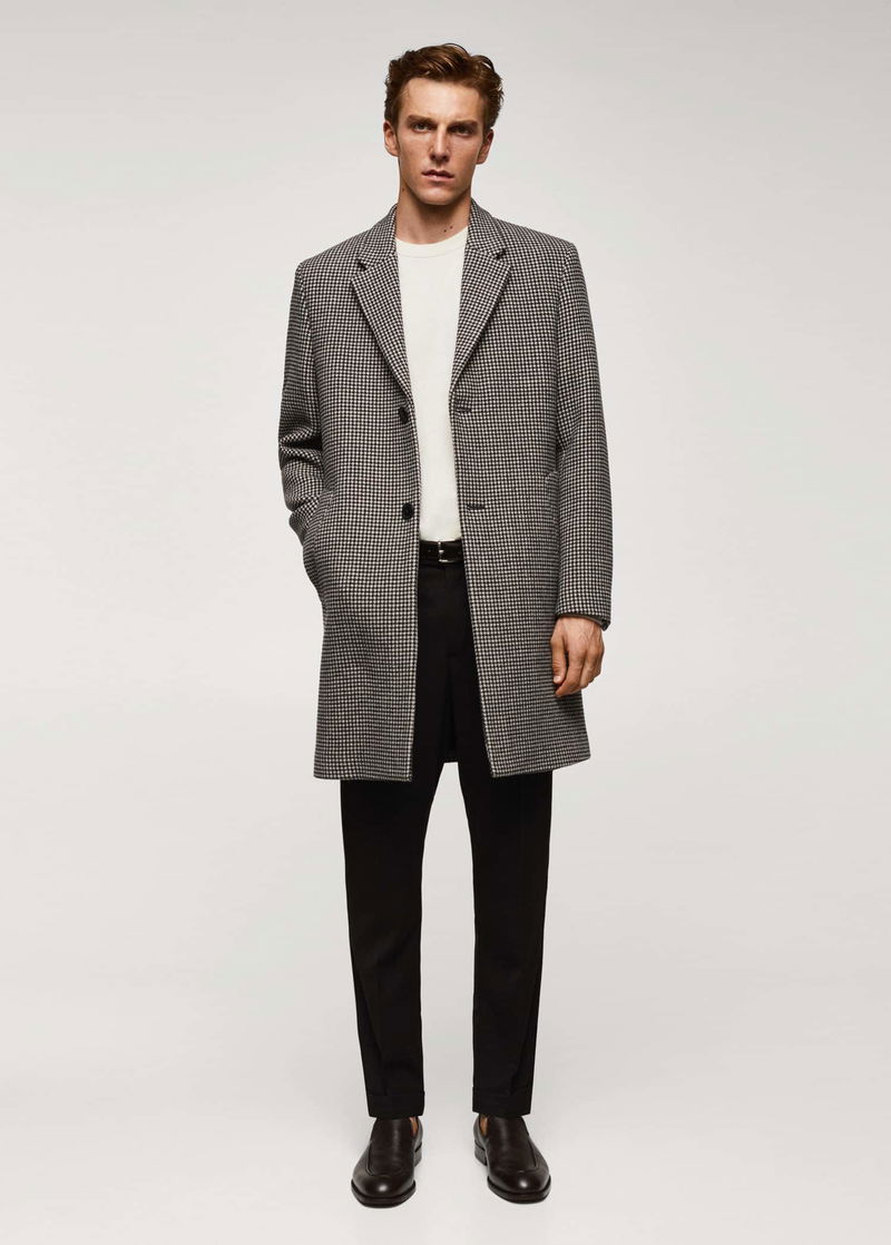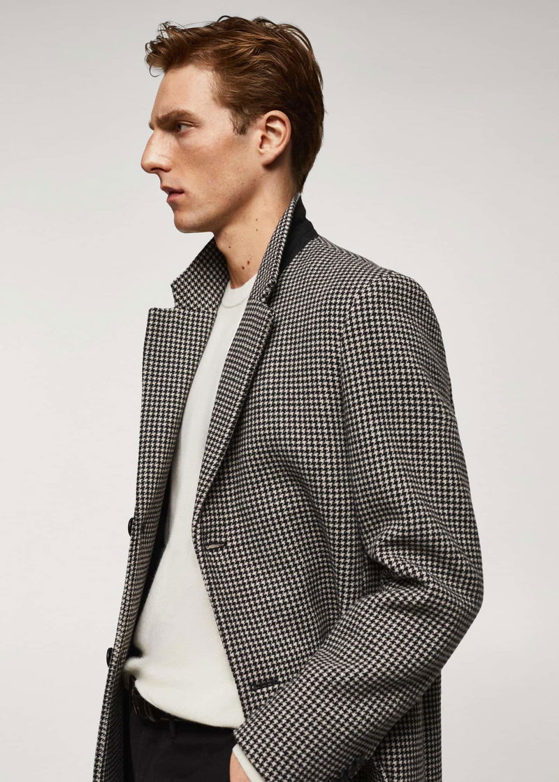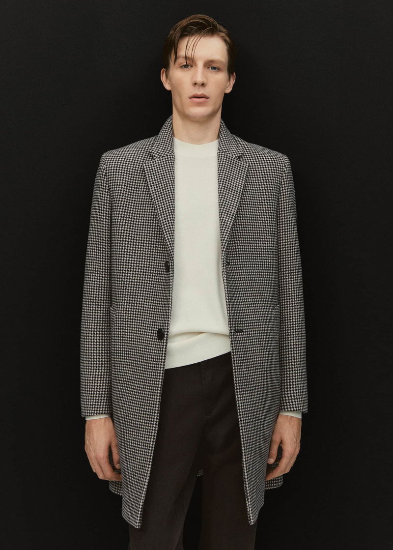 Regular fit. Houndstooth print. Long design. Lapel-collar. Front button closure. Two side welt pockets. Long sleeve with buttoned cuffs. Back-slit hem. Inner pocket. Inner lining.
