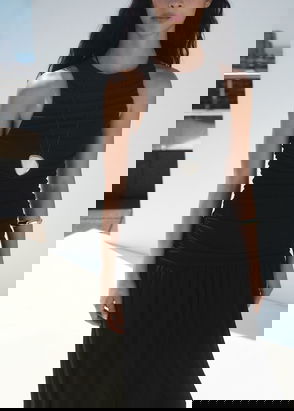Fine-knit fabric. Midi design. Straight design. Round neck. Sleeveless. Wide straps. Contrast edge. No fastening.
