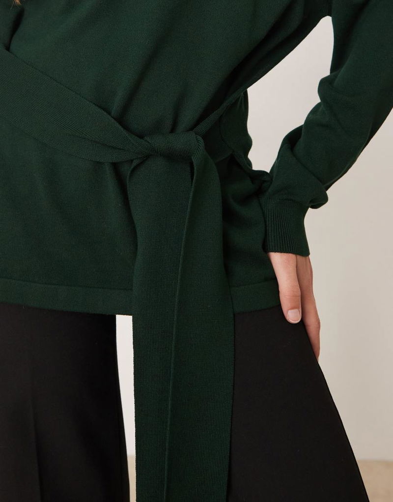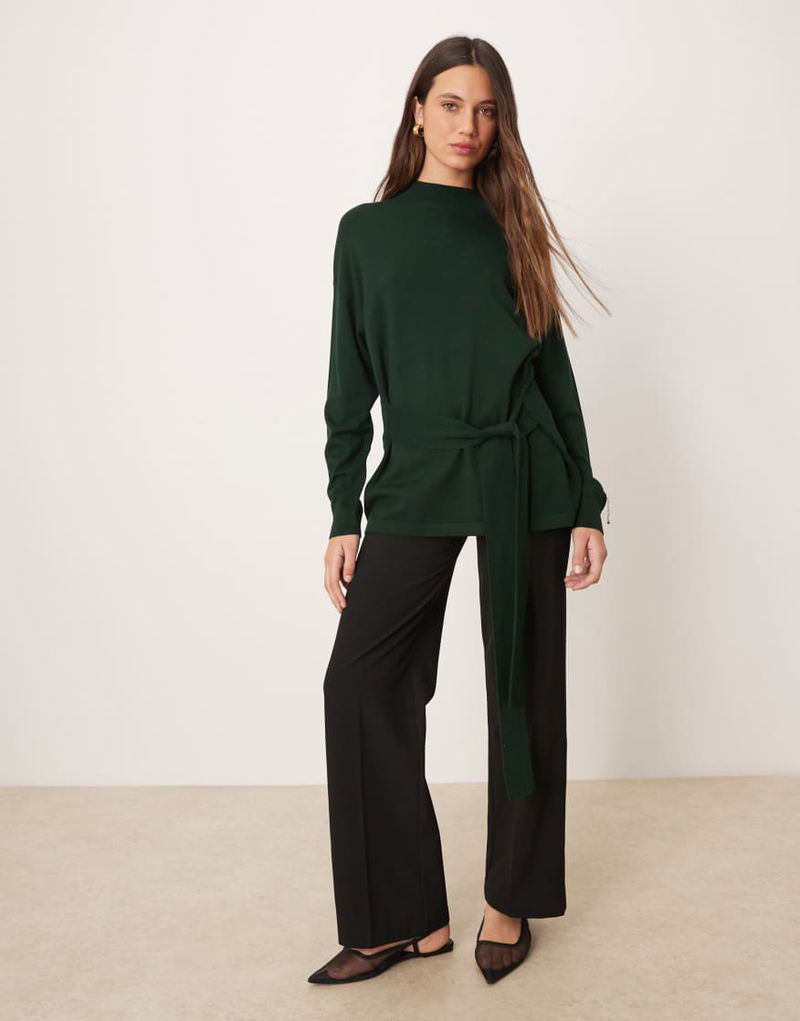 Knitted High Neck Tie Waist Jumper In Khaki