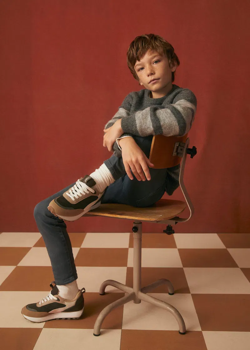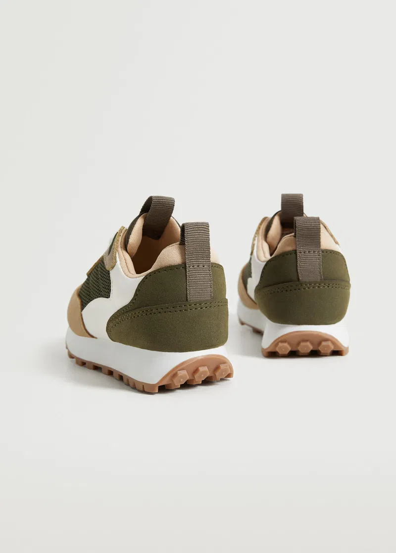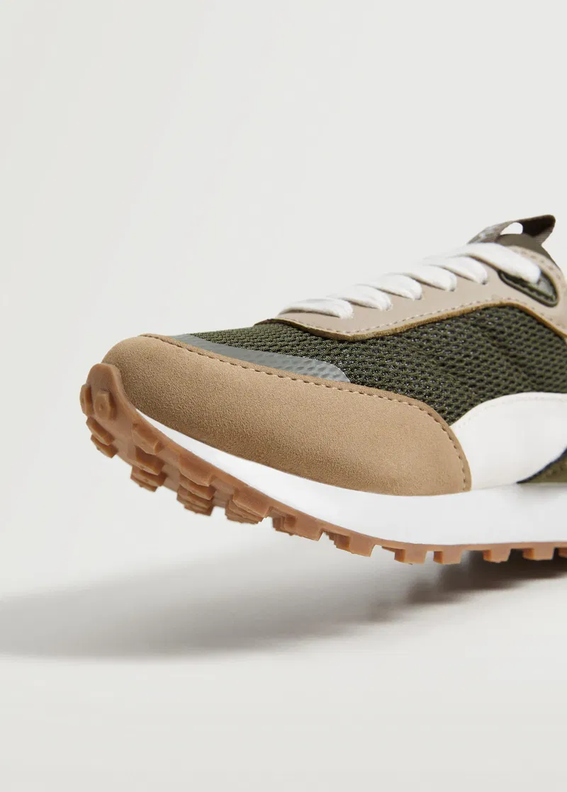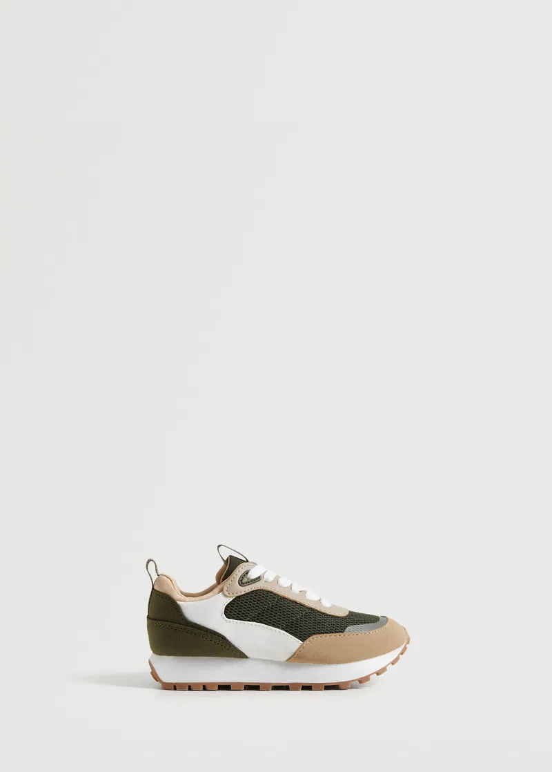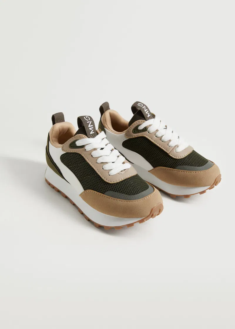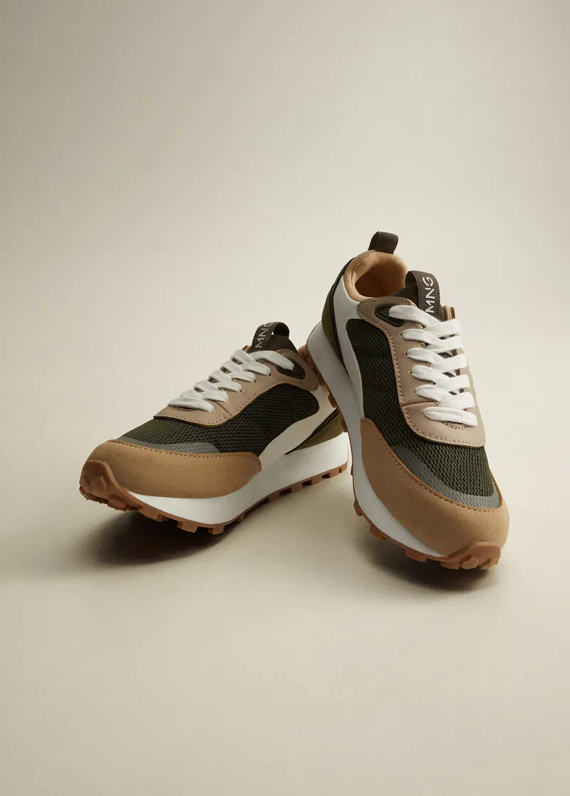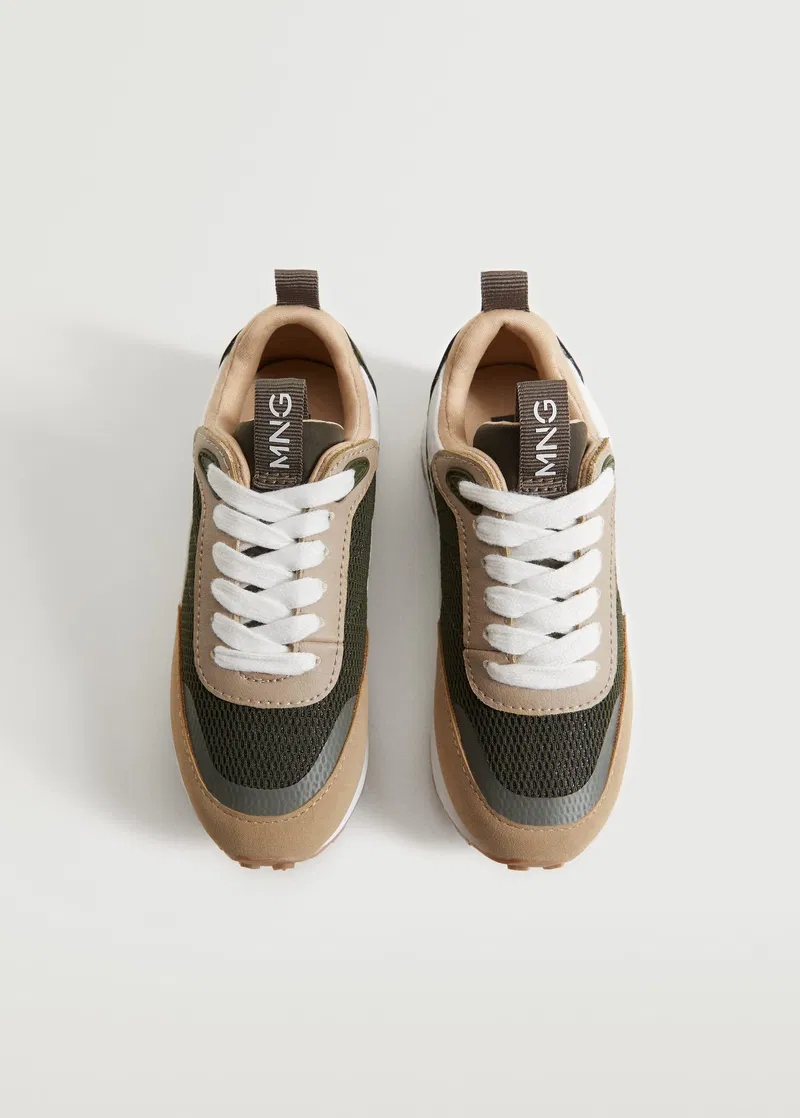 Flat, Combined fabrics, Rounded toe, Toothed sole, Inner lining, Laces.