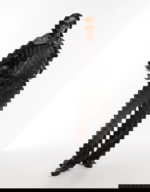 Faux leather. Oversize design. Shirt collar with sheepskin collar. Long sleeve. Two front pockets. Front zip and button closure. Inner lining.