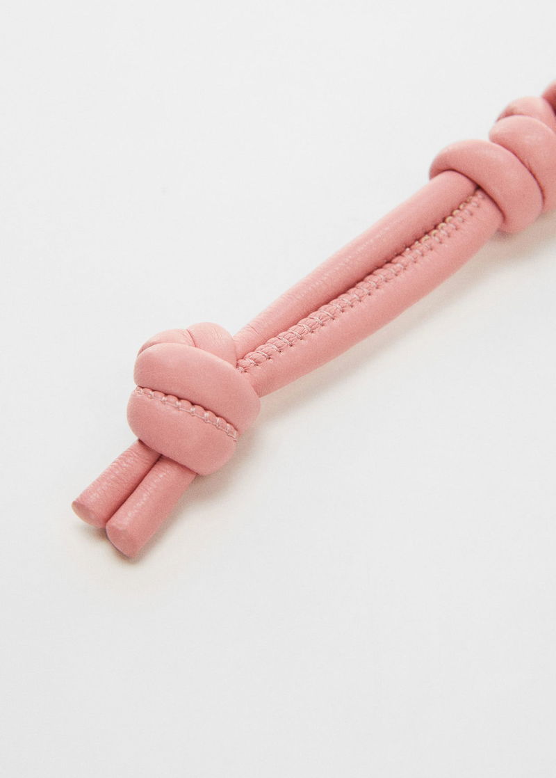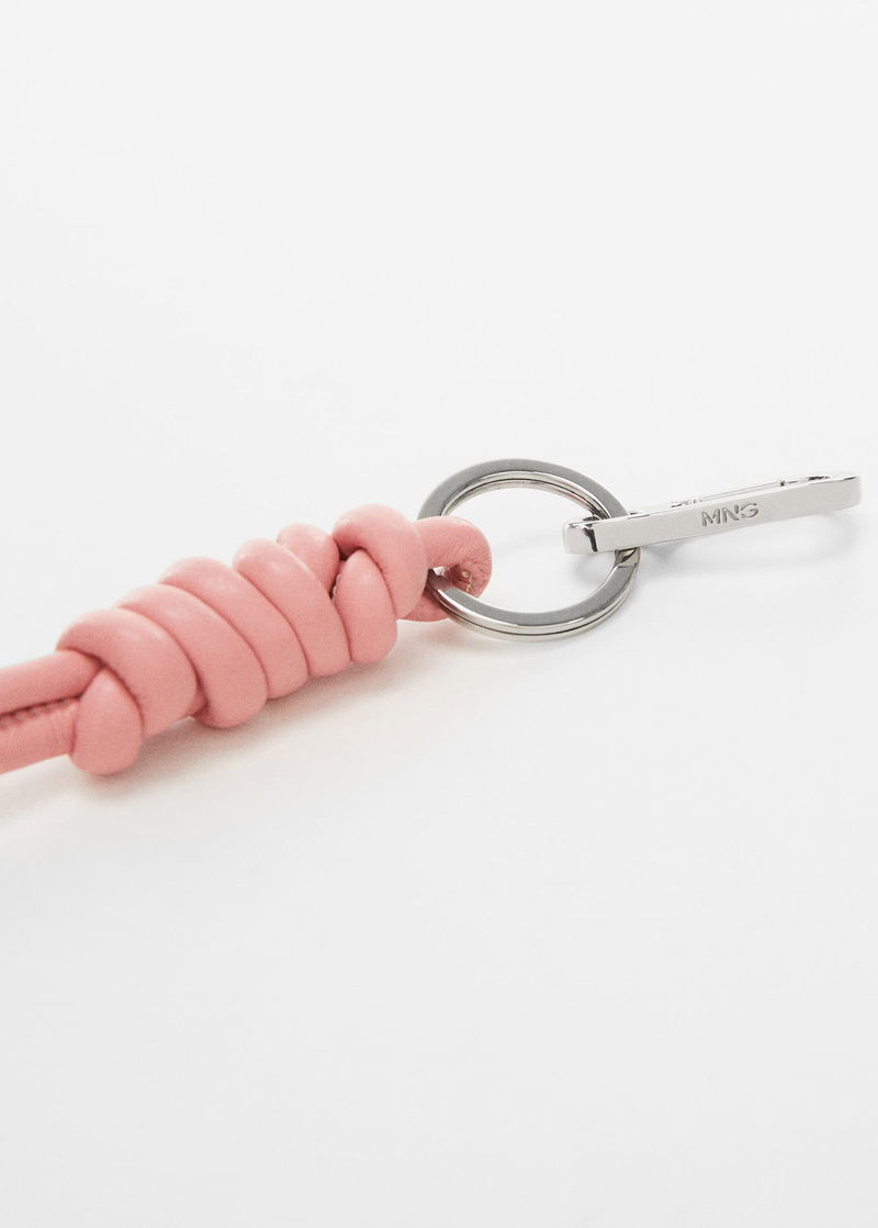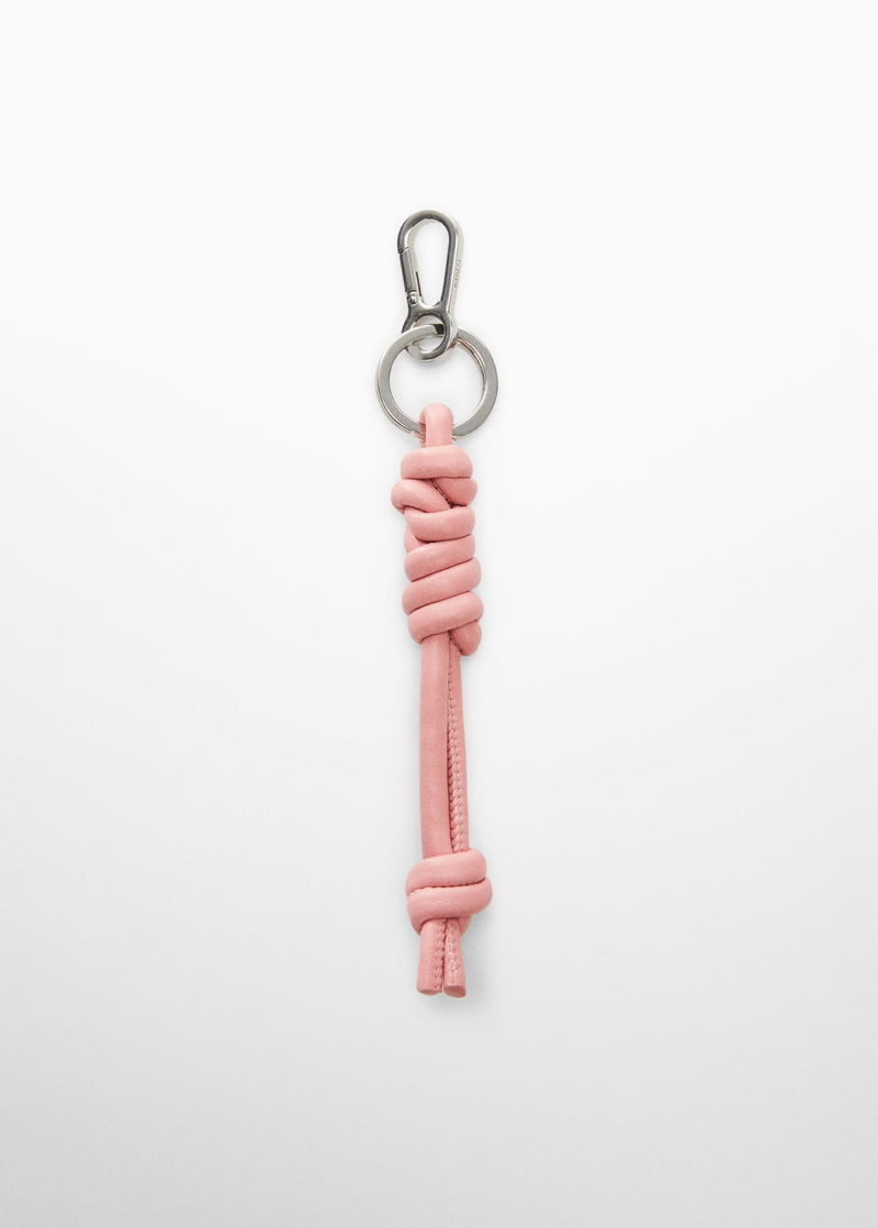 Small, Faux leather, Carabiner fastening, Key ring detail, Knot detail.
