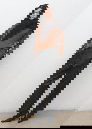 Faux leather, Straight design, Long design, High waist, Loops, Five pockets, Zip and one button fastening.