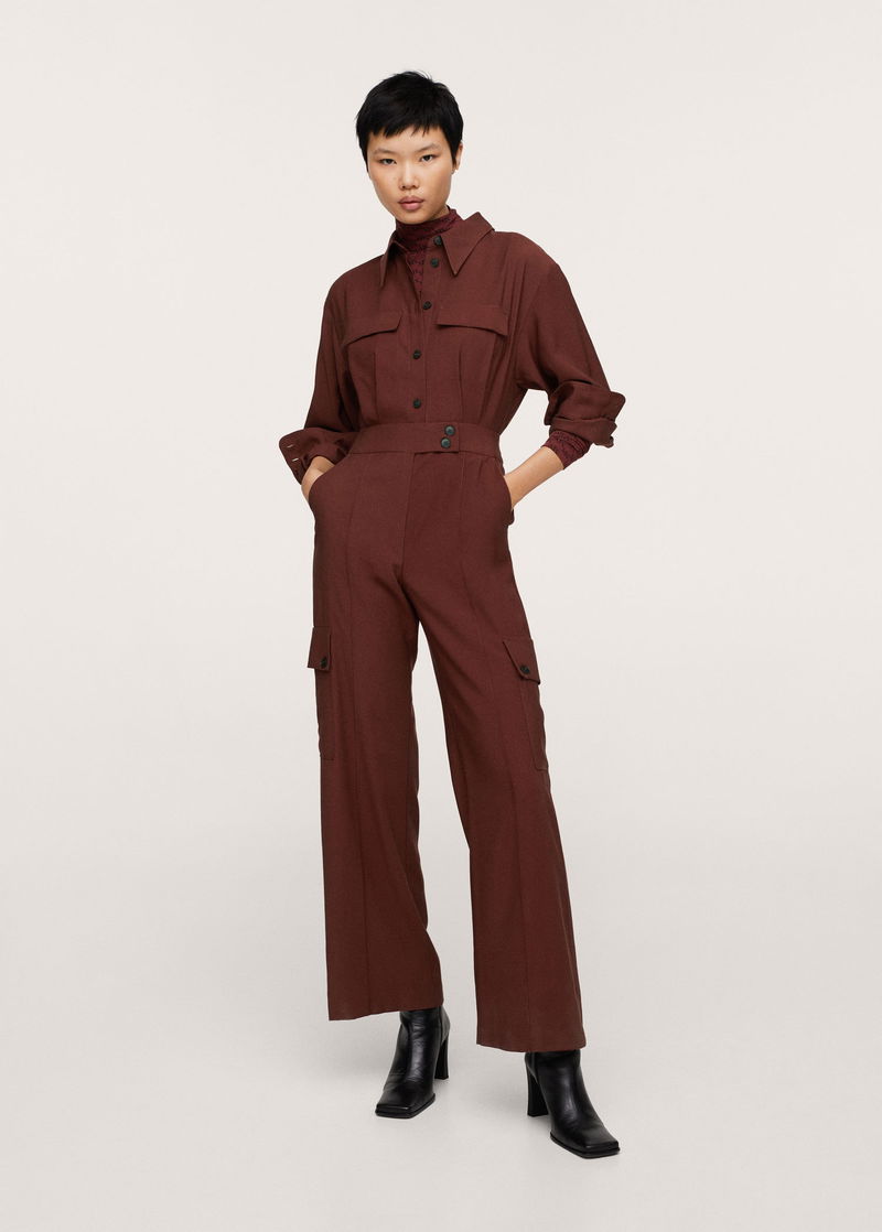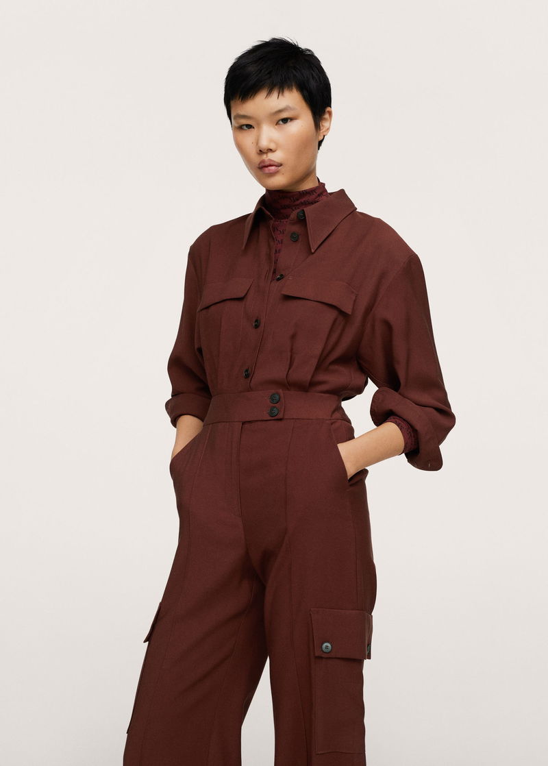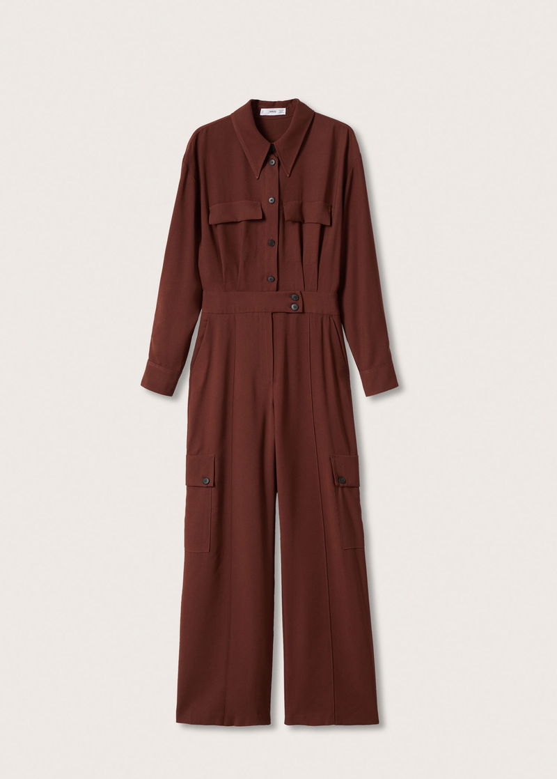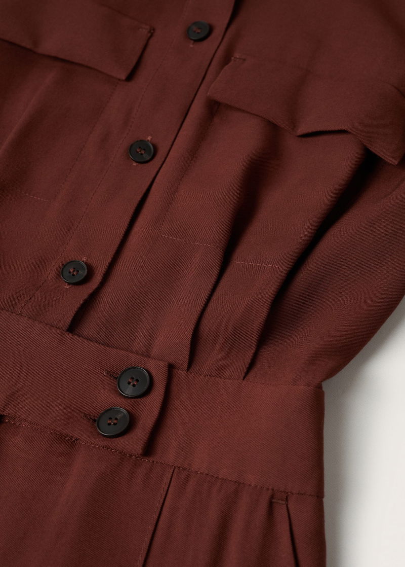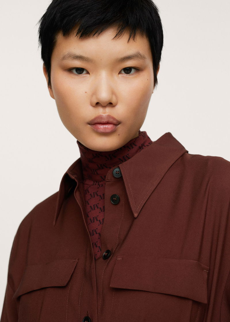 Flowy fabric, Straight design, Long design, Shirt-style collar, Long sleeve, Four buttoned flap pockets at front, Two side pockets, Interior cotton lining.