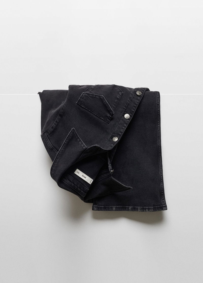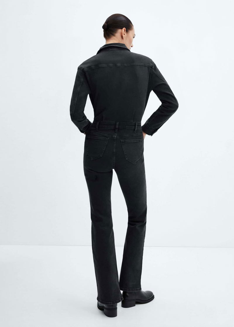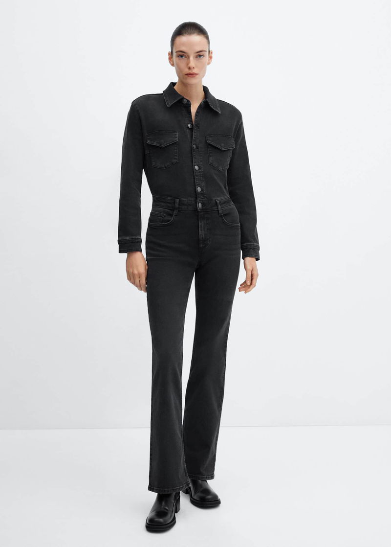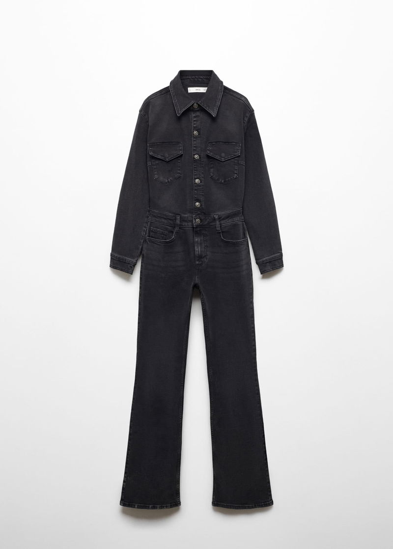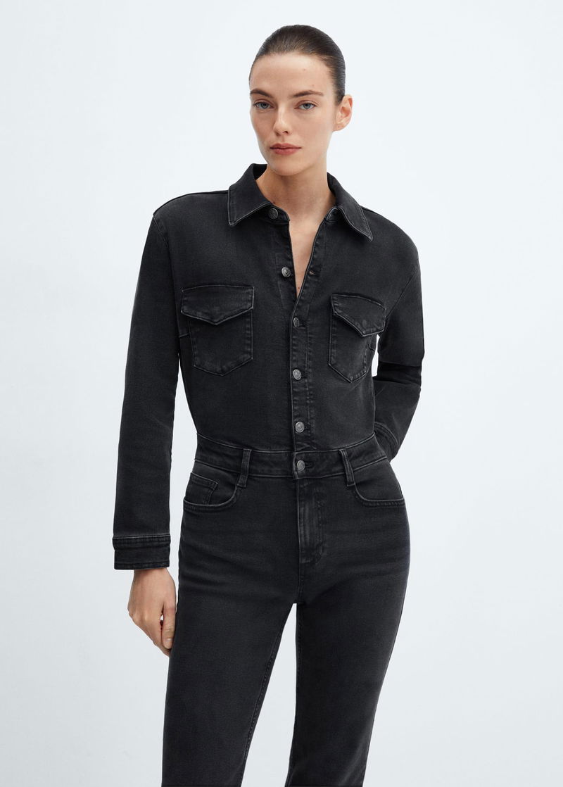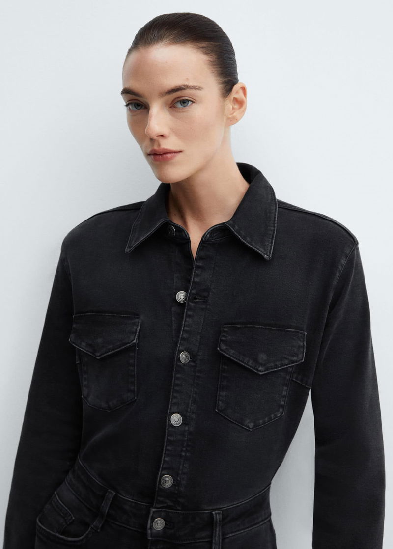 Cotton fabric, denim fabric, long design, shirt-style collar, long sleeve with buttoned cuffs, two buttoned chest pockets, two side pockets, two patch pockets on the back, zip and button fastening, belt loops.
