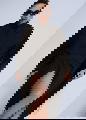 Flowy fabric, Satin, Long design, Straight design, Adjustable design, Shirt-style collar, Long sleeve with buttoned cuffs, Button fastening on the front section, Asymmetric button fastening, Adjustable rope on the back.