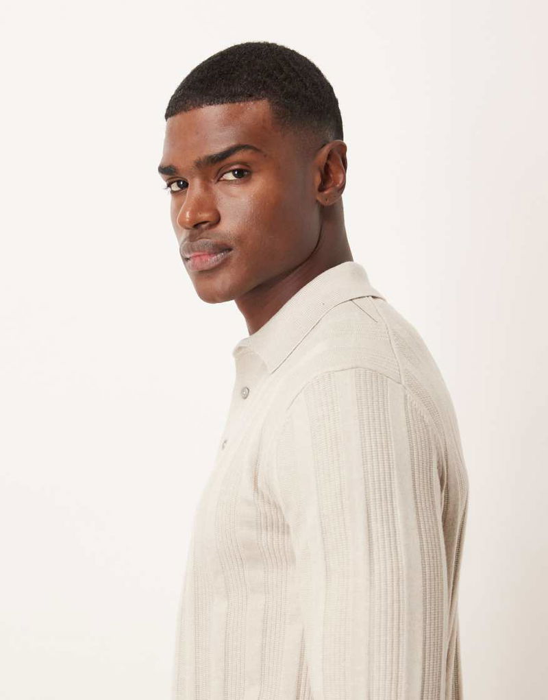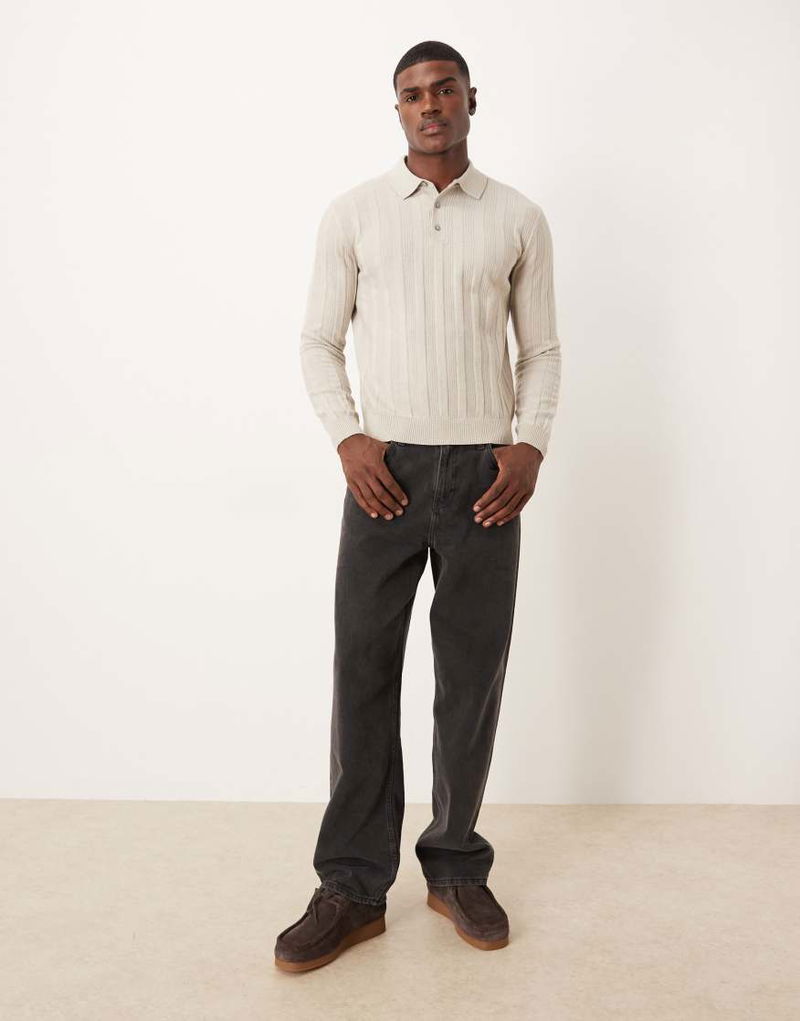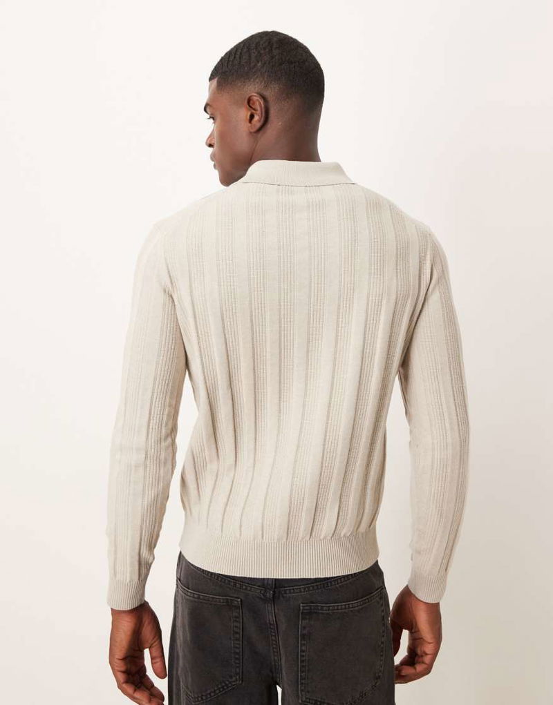 Long Sleeve Cable Knit Polo Shirt In Light Beige