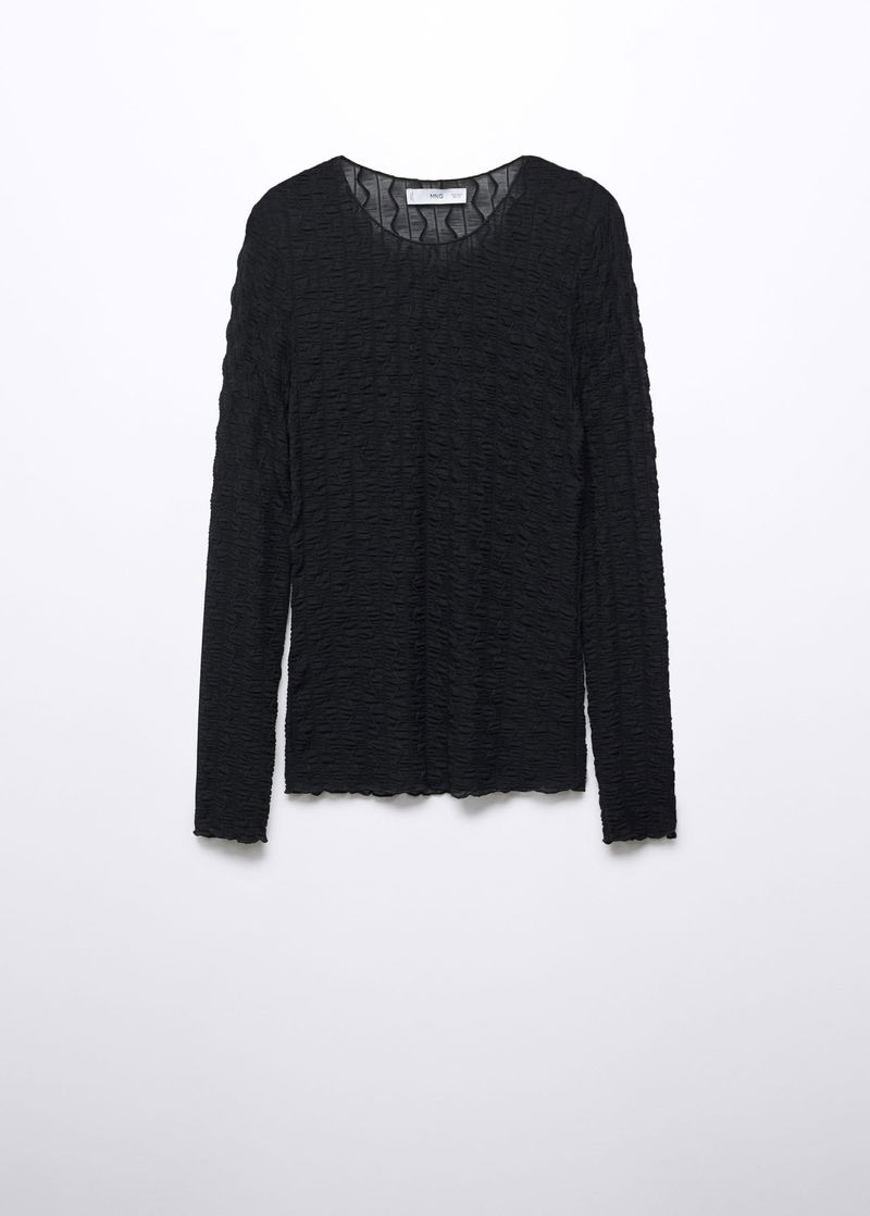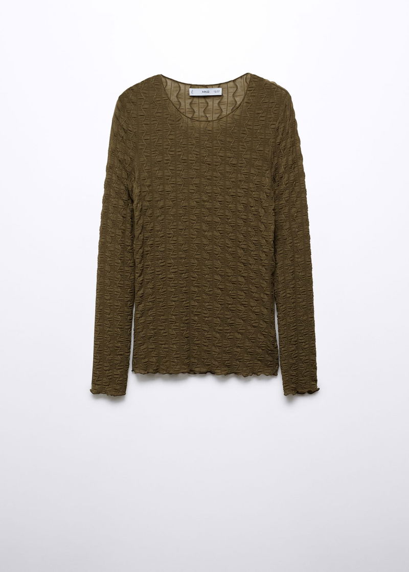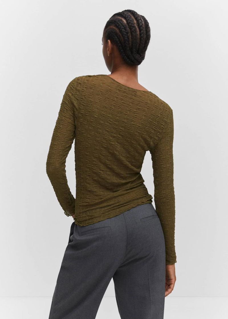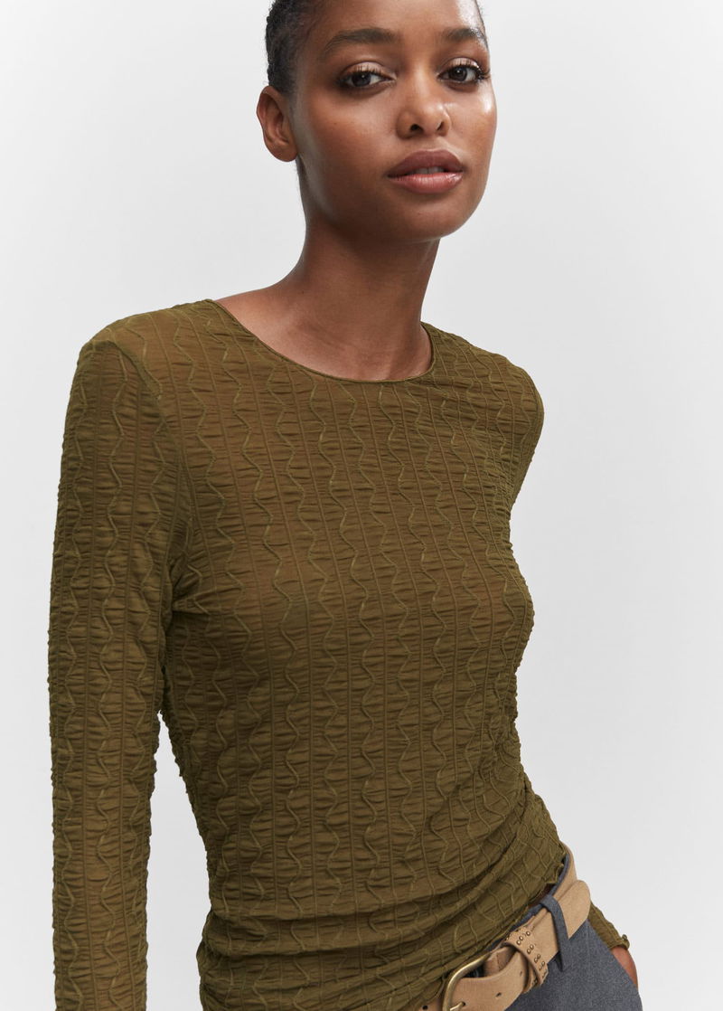 Elastic, Elastic gathered section, Tailored design, Rounded neck, Long sleeve.