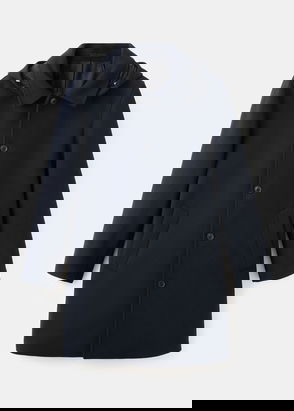 Party collection. Wool mix fabric. Straight silhouette. Notched lapel. Two side pockets. Long design. Inner lining. Long sleeve. Front closure with buttons. Back-slit hem.