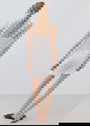 Lyocell fabric, Removable bow on the waist, Two side pockets, Elastic waist, Loops on the waist, Inside leg measurement 5.63 in Side length 19.09 in.