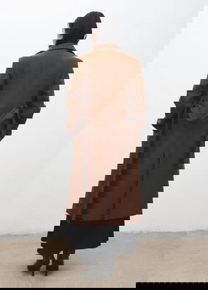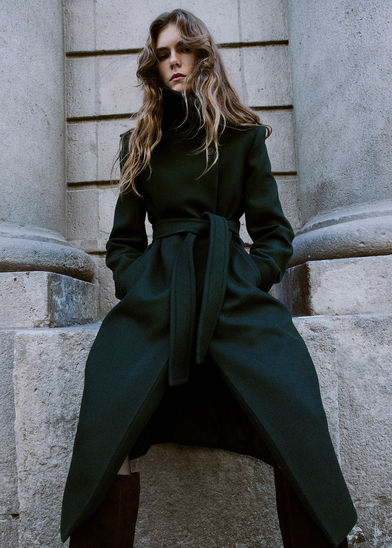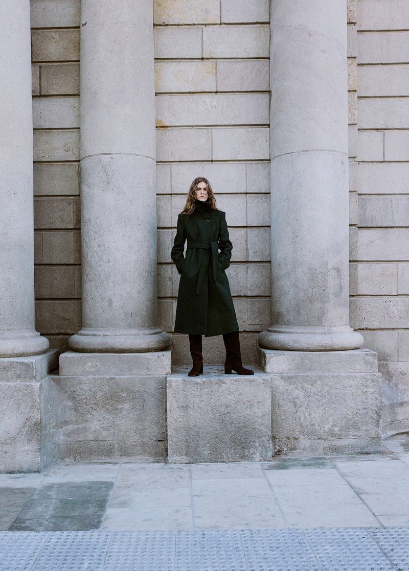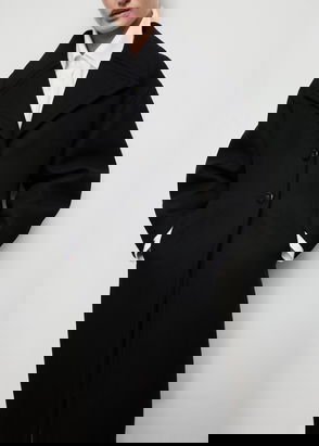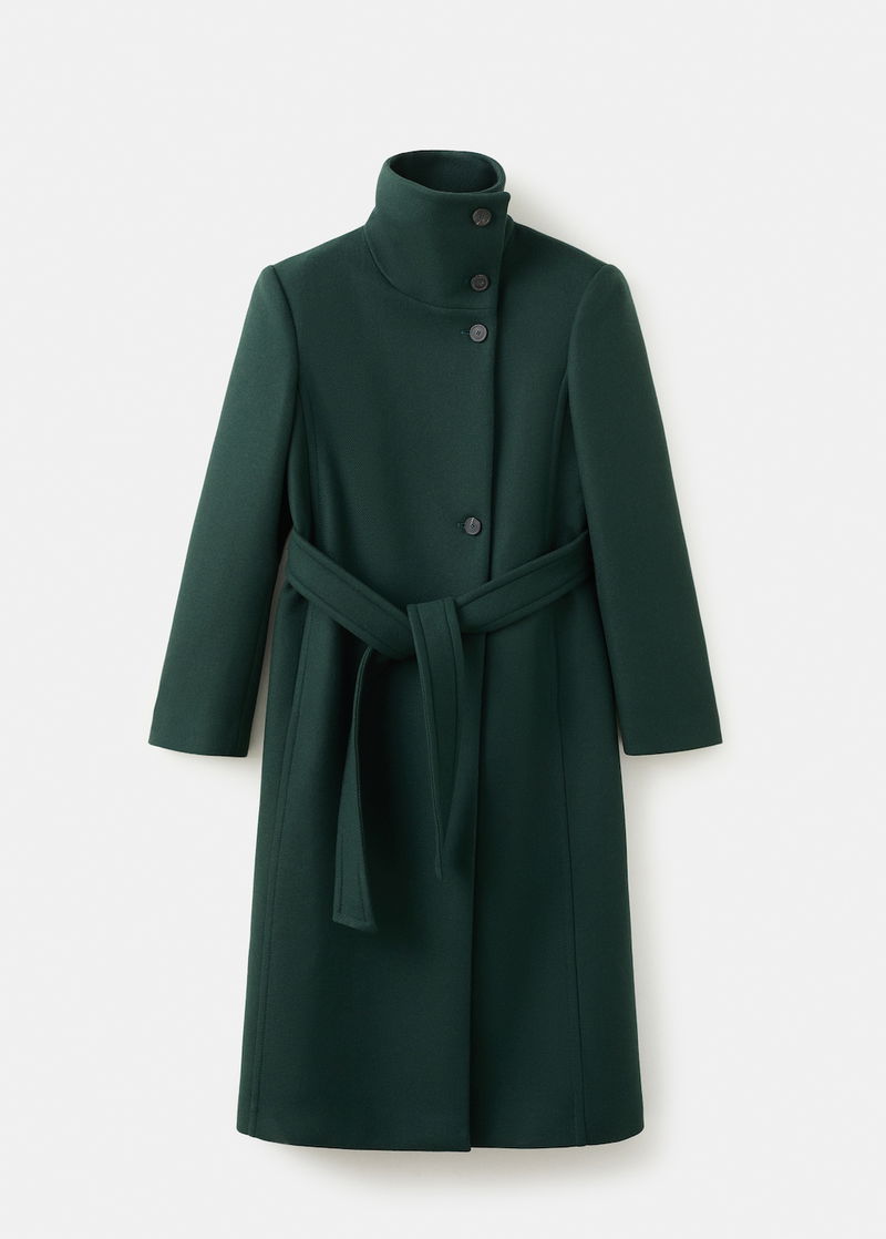 Italian Manteco wool fabric. Virgin wool blend fabric. Long design. Straight Design. Funnel neck. Long sleeve. Belt loops. Nightgown-style belt. Front button closure. Inner lining.
