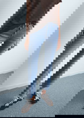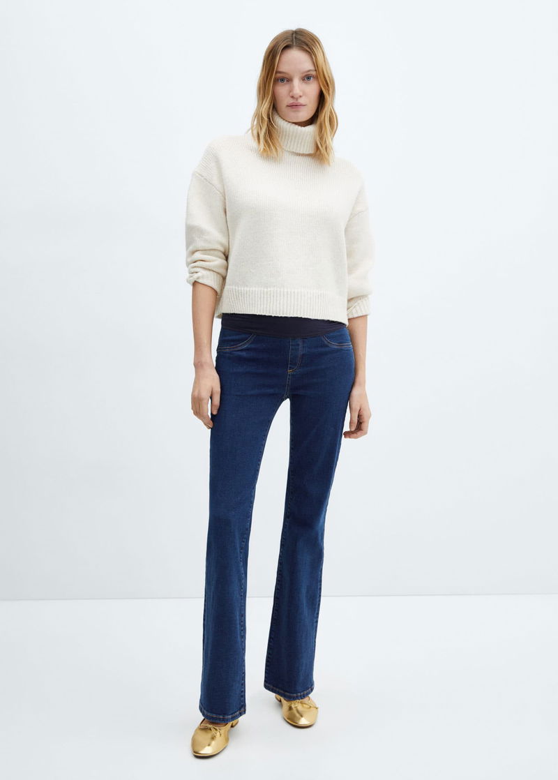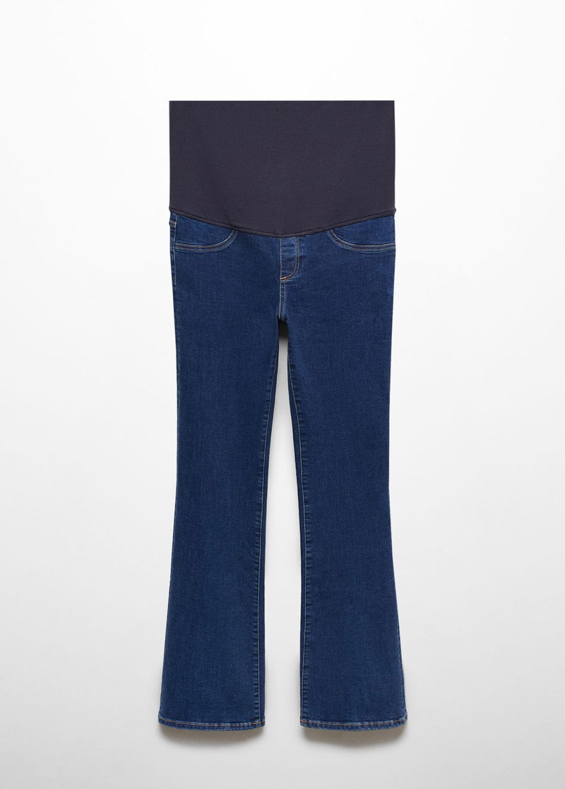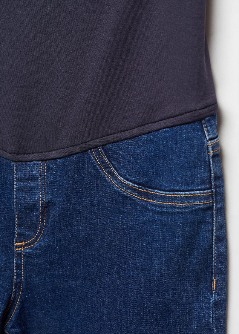 Denim style cotton fabric, Flared design, Low waist, Two patch pockets on the back, Elastic waist, Soft elastic at front side waistband for added comfort and support the growing bump, Without waistband, Unclosed.