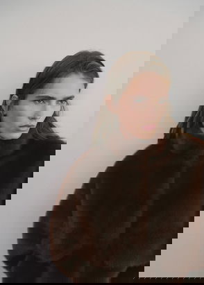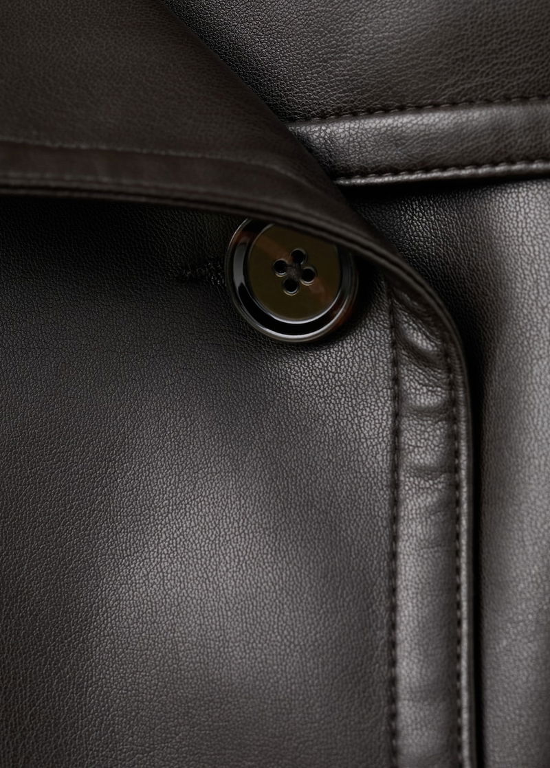 Faux leather. Oversize design. Short Design. Crossover collar with lapel. Wide lapels. Long sleeves with buttoned cuffs. Two side pockets. Double button fastening. Nightgown-style belt. Inner lining.