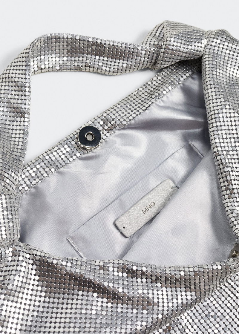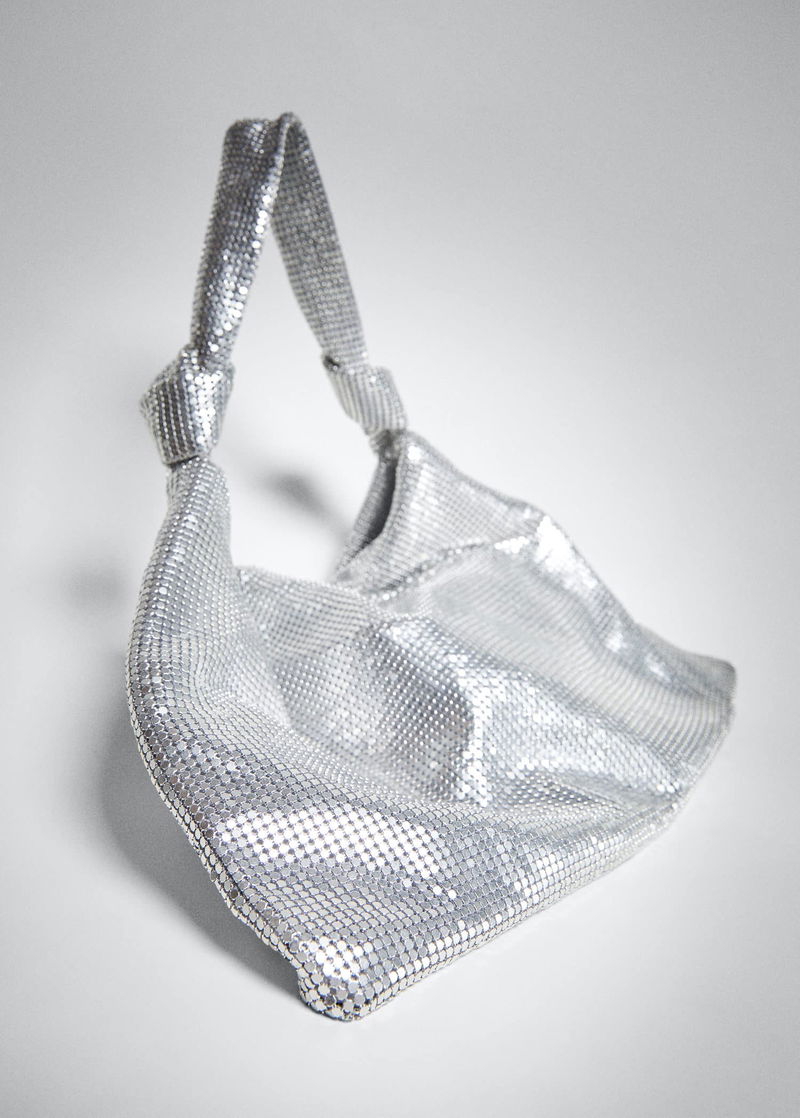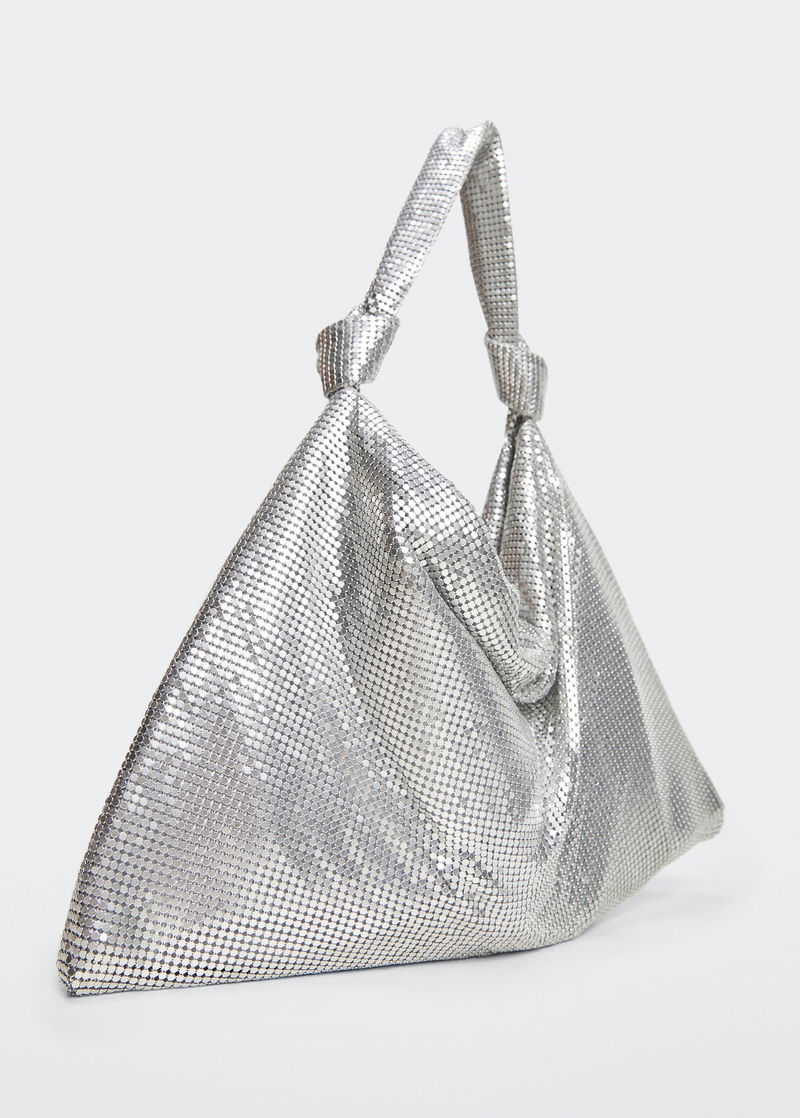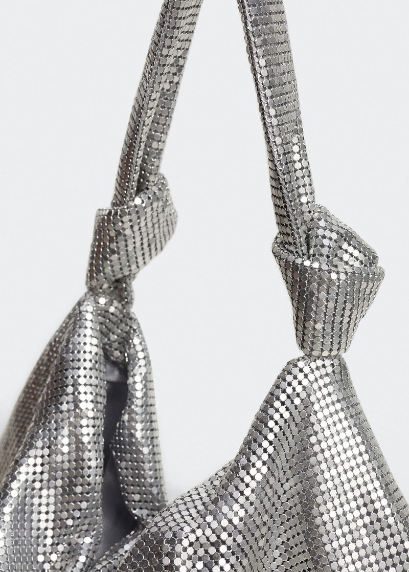 Mesh fabric, Metallic appliqués, Bucket design, Medium, Knot detail in the handle, Inner pocket, Magnetic metallic fastening, Inner lining