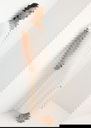 Flowy fabric, Metallic thread detail, Flared design, Rounded neck, V-neck, Long puffed sleeves, Button fastening on the front section, Bow on the waist.