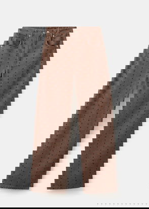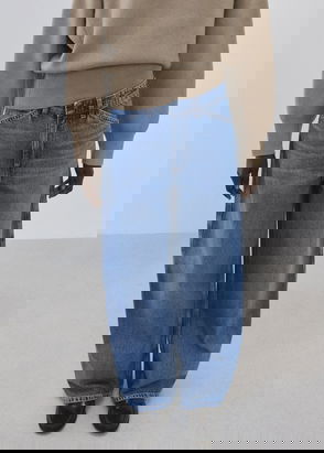 Product on sale. Denim-style cotton fabric. Long design. Balloon Design. Mid-rise. Belt loops. Five pockets. Button and zip fastening. Inside length 79 cm.