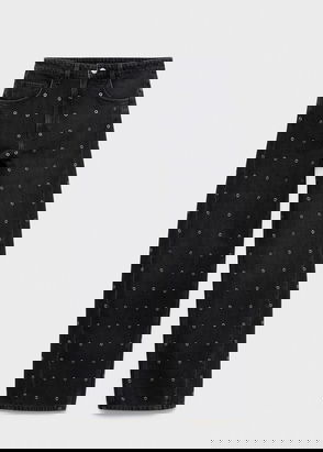 Denim-style cotton fabric. Long design. Balloon Design. Barrel style. Mid-rise. Belt loops. Five pockets. Button and zip fastening. Inside length 79 cm.