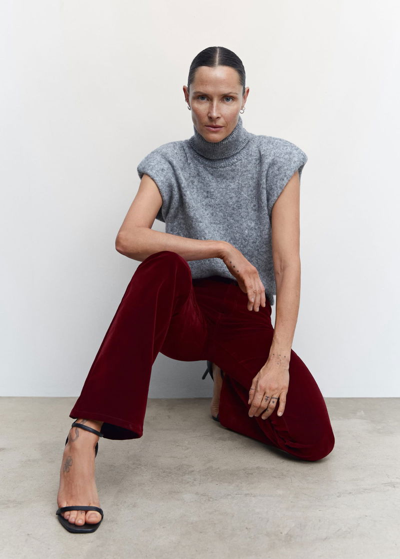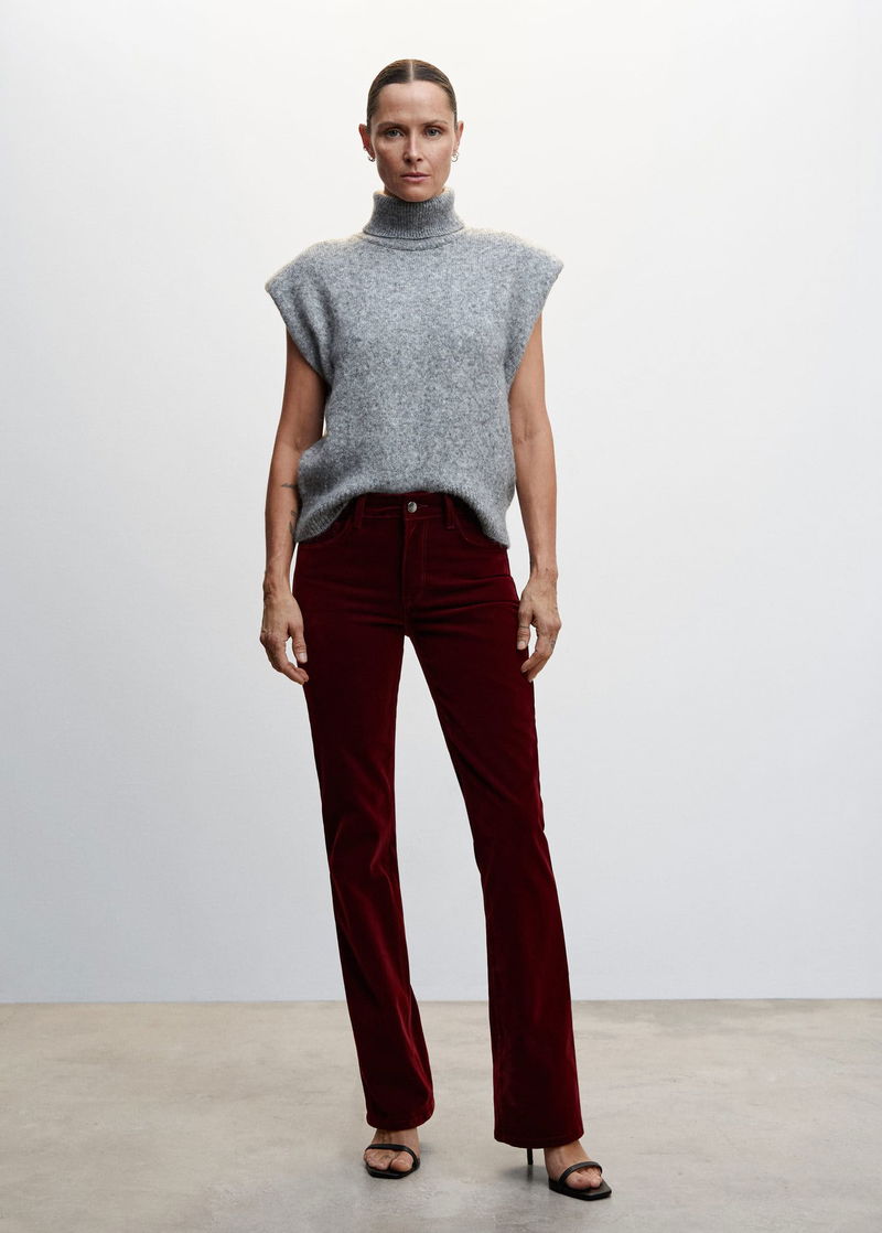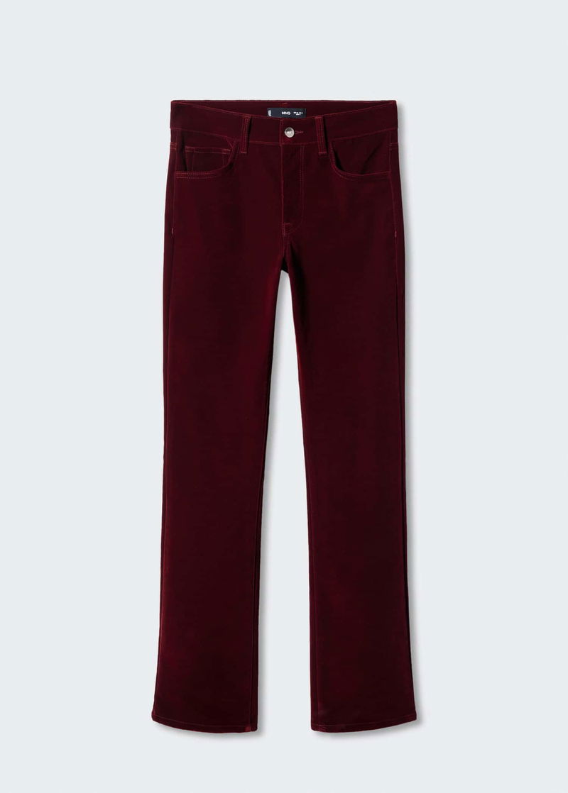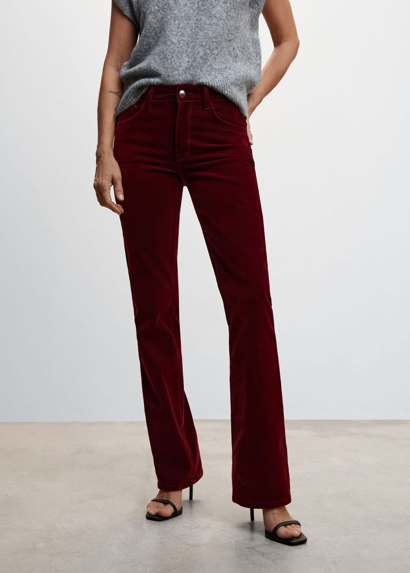 Cotton-blend fabric, Velvet fabric, Flared design, Medium waist, Long design, Inseam 83 cm , Zip and one button fastening, Loops.