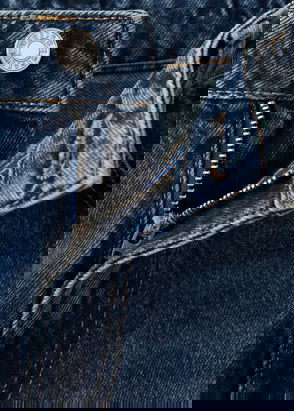 Denim style cotton fabric, Mom-fit, High waist, Loops, Five pockets, Zip and one button fastening.