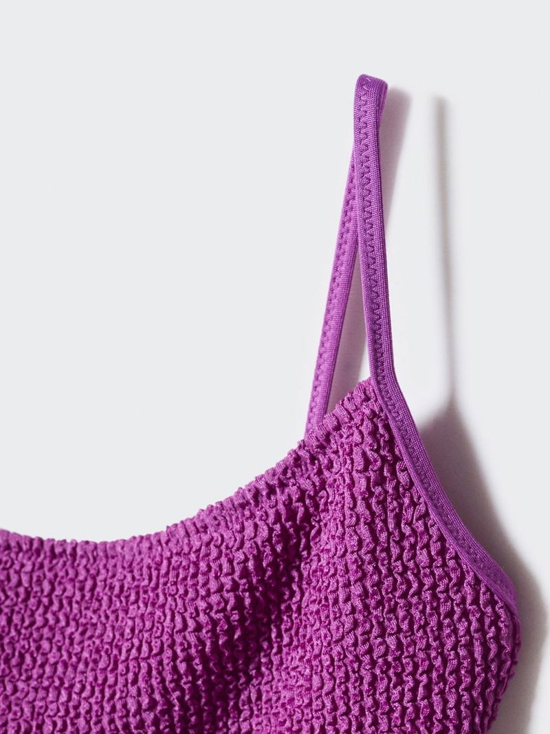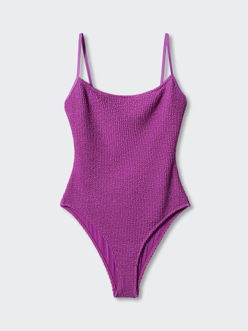 Destined for sun-drenched beach days, this textured swimsuit by Mango suspends from spaghetti straps and is finished with a scooped back.