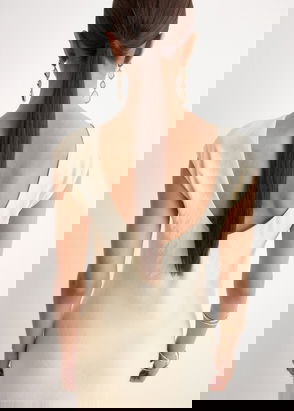 Fine-knit fabric. Crochet design. Short design. Straight design. Boat neck. Long flared sleeve. Back neckline. Back knot closure.