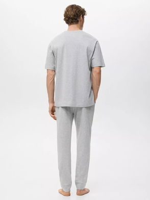 T-shirt and pyjama trousers pack, Organic cotton-blend fabric, Combined design, T-shirt, Striped design, Rounded neck, Shorts, Two side pockets, The model is 187 cm tall and is wearing a size M, Elastic waist with drawstring.